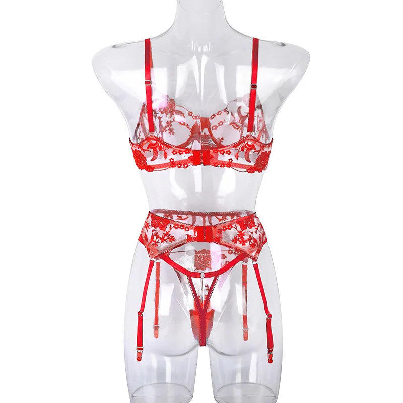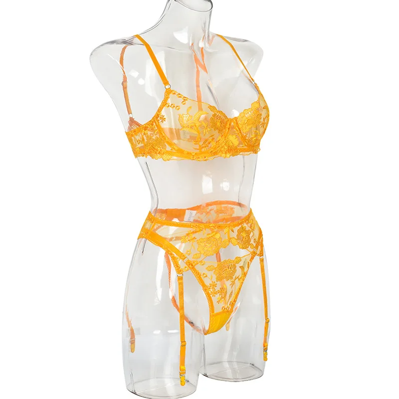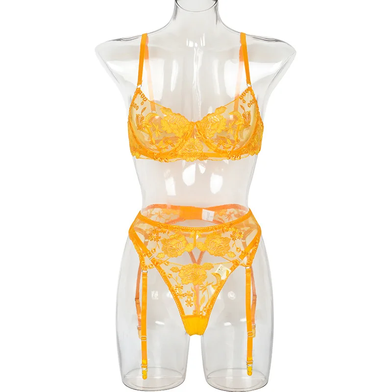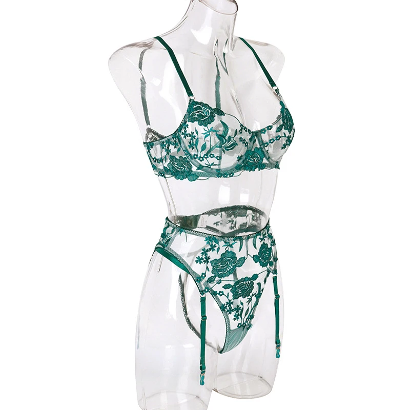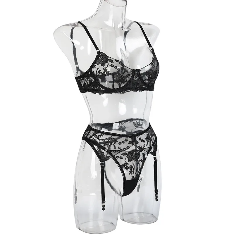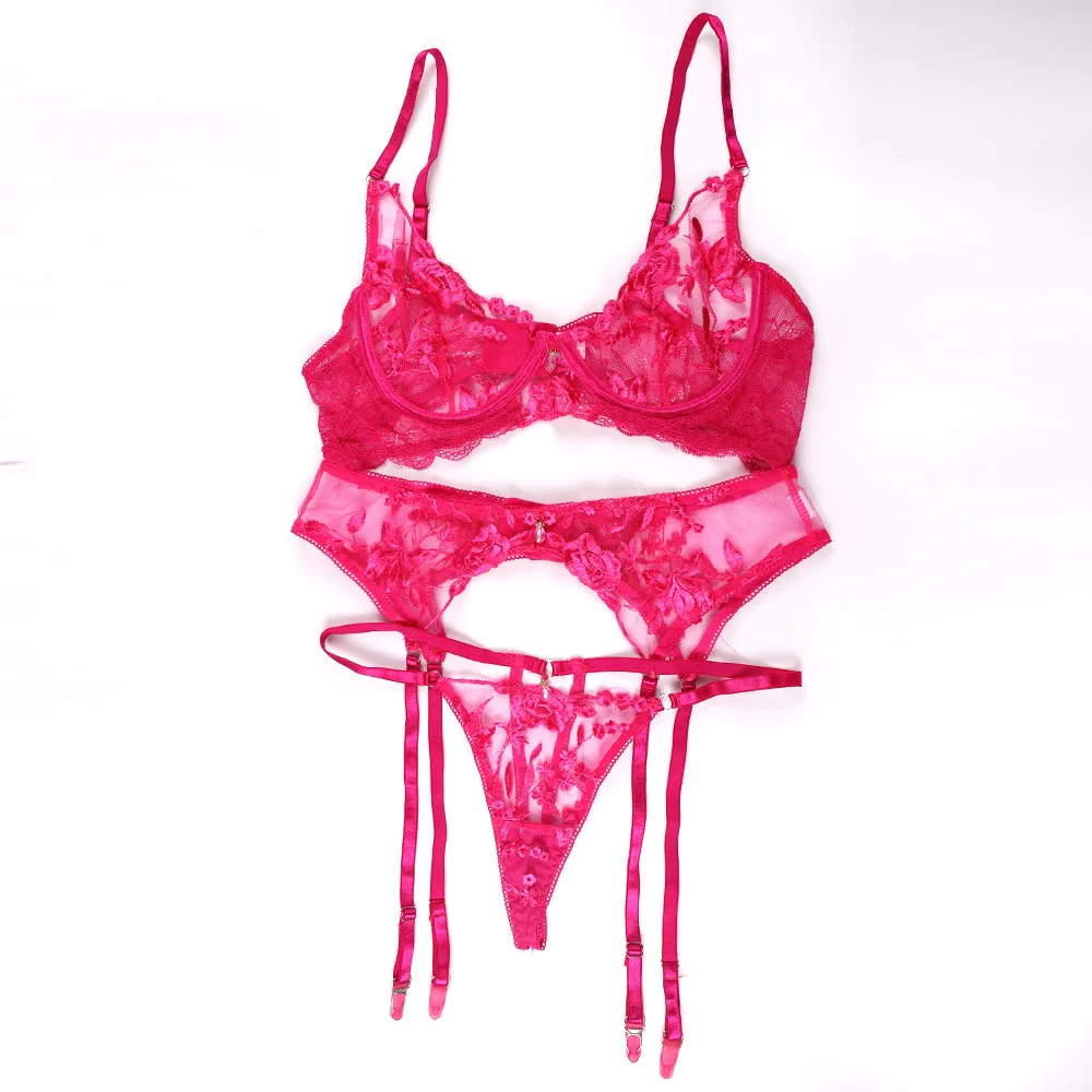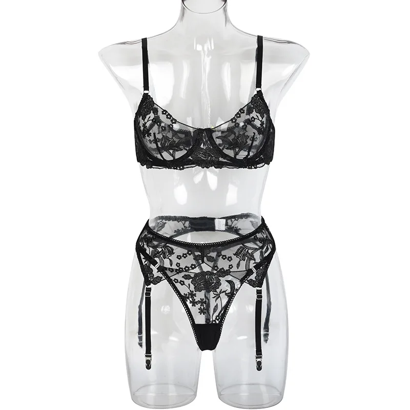Женское сексуальное нижнее белье с вышивкой, нижнее белье, цветочные эротические костюмы, открытый бюстгальтер и стринги, комплект из 3 предметов с экзотическим бюстгальтером на косточках