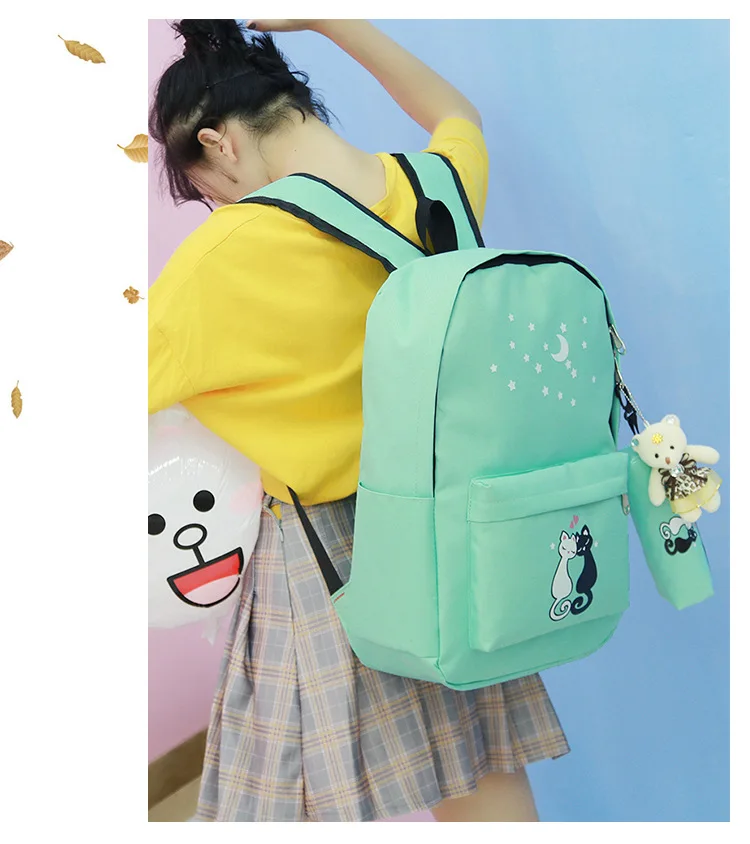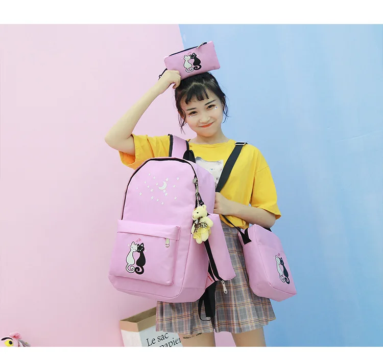 4 шт.компл. женский рюкзак с принтом кошки, холщовые школьные ранцы...