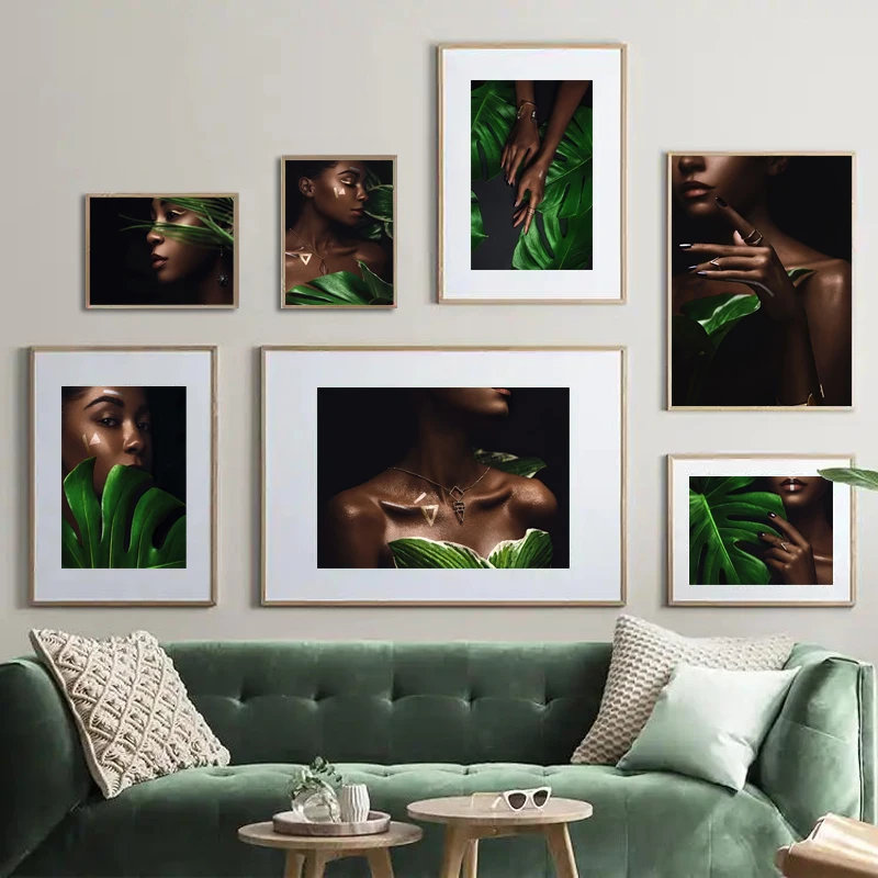 Художественная настенная Картина на холсте с зелеными листьями, девушкой, абстрактной женщиной, скандинавские черные модельные плакаты и принты, картины для декора гостиной