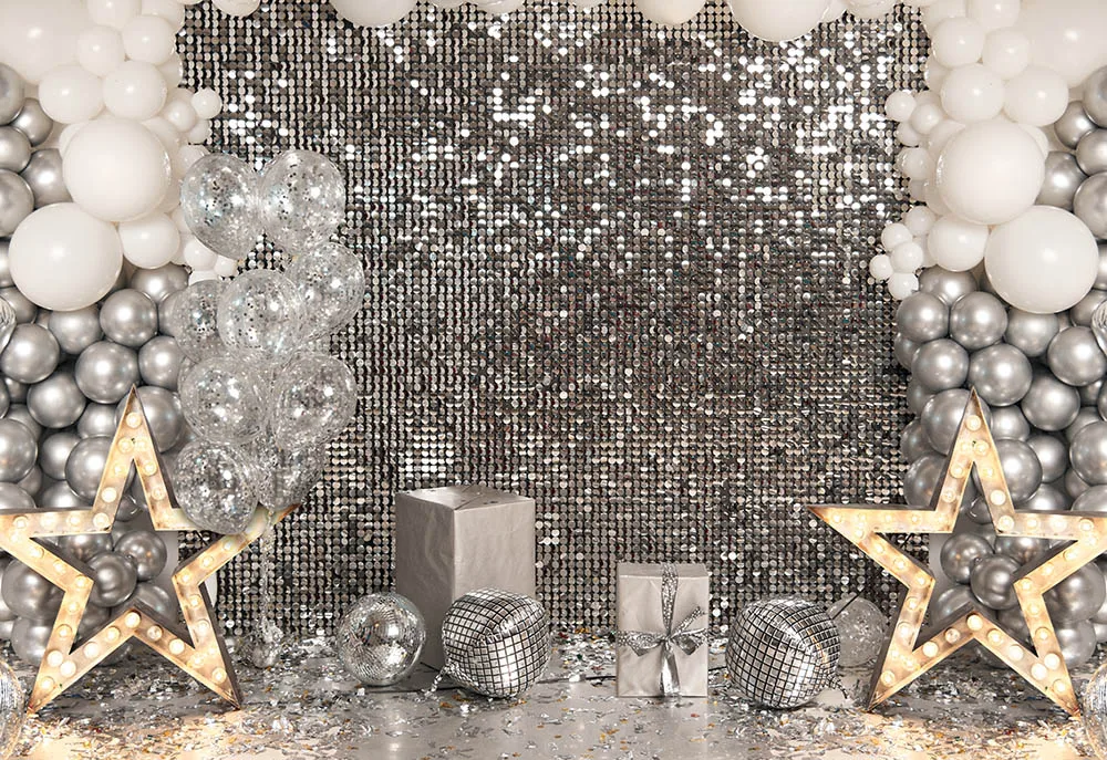 Фон для фотосъемки с изображением торта на диско, серебристого цвета, для взрослых и детей 80-90-х годов, Портрет фон с воздушными шарами звезд, день рождения