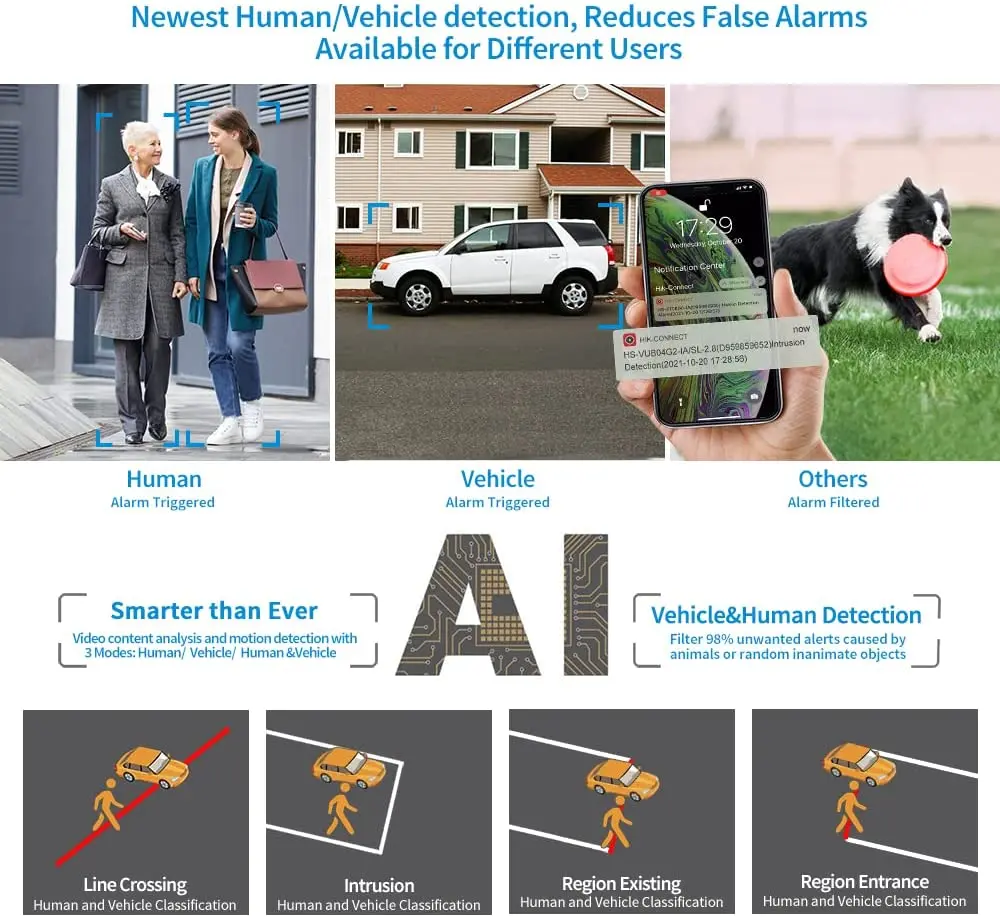 Технология Hikvision AcuSense:1. Вторжение человека и транспортного средства, освещает события, которые имеют наиболее распространенные проблемы в области защиты периметра, являются вторжением и поломками транспортного средства.AcuSense помогает Вам сфокусироваться на этих событиях двумя способами: будильник будет срабатывать только при размещении предустановленного типа вторжений, а соответствующие видео сортируются по категориям для более удобного поиска