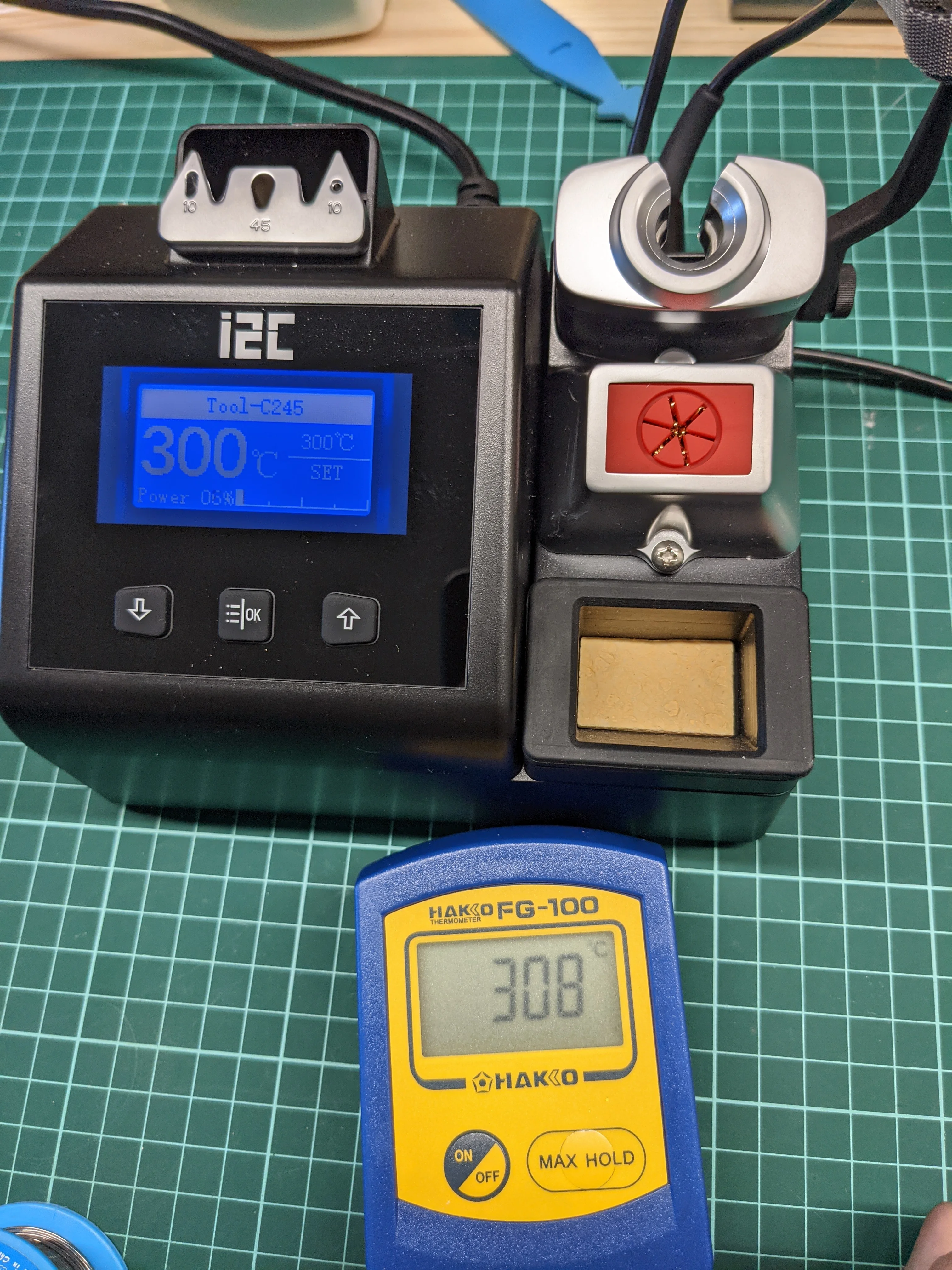 Эта станция I2C * намного * лучшего качества, чем Sugon T26 или Jabe UD1200. Как JBC станция, она может использовать различные серии ручек. Крутая и тихая 100 ва тороидальная, потребляемая мощность холостого хода <3 Вт. Прецизионный TC amp, датчик тока с эффектом холла, защита ESD на всех входах. Вся силиконовая проволока, даже внутри станции. Даже более мощный, чем станция JBC. Программное обеспечение достаточно полное. Однако это не идеально. При 230 В и выше он движется C245 намного выше 130 Вт, риск выгорания нагревательного элемента. При 230 В + 10% он будет управлять 180 Вт. В отличие от JBC, нет датчика тока заземления, чтобы определить, прикасается ли наконечник к приведенным в действие частям. Всего несколько мА постоянного тока могут дуть датчик TC и вызвать всплеск температуры. Поставляемые наконечники I2C имеют дефектное производство. Чрезвычайно высокая термостойкость от нагревателя до припоя. Подсказки Jabe работают хорошо. Пластик не устойчив к плавлению.