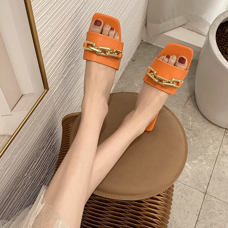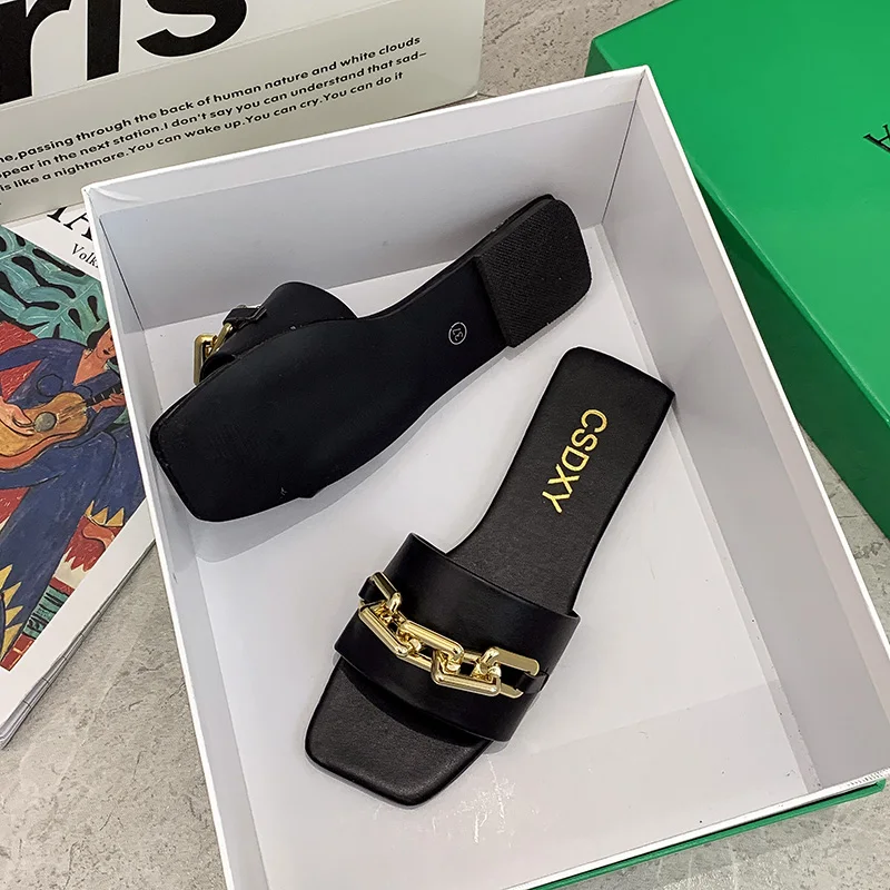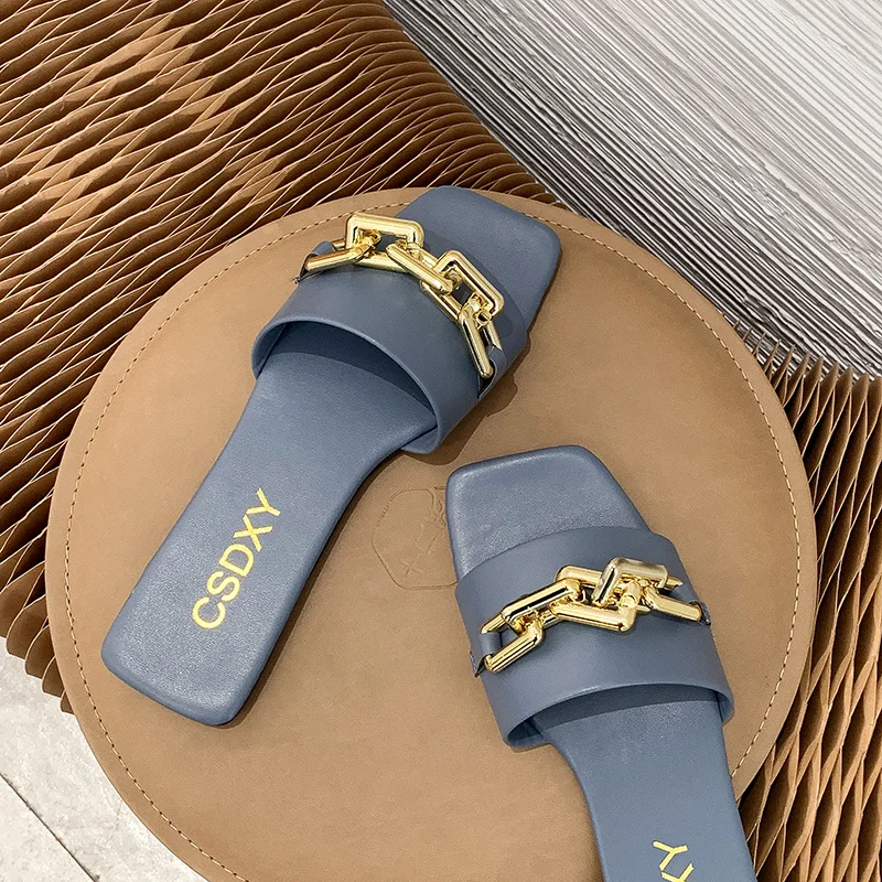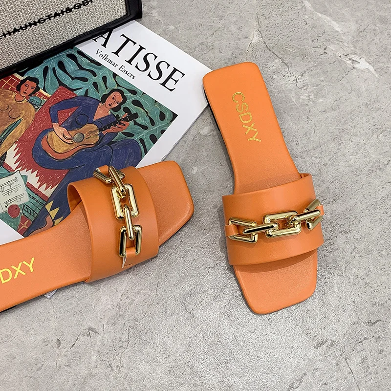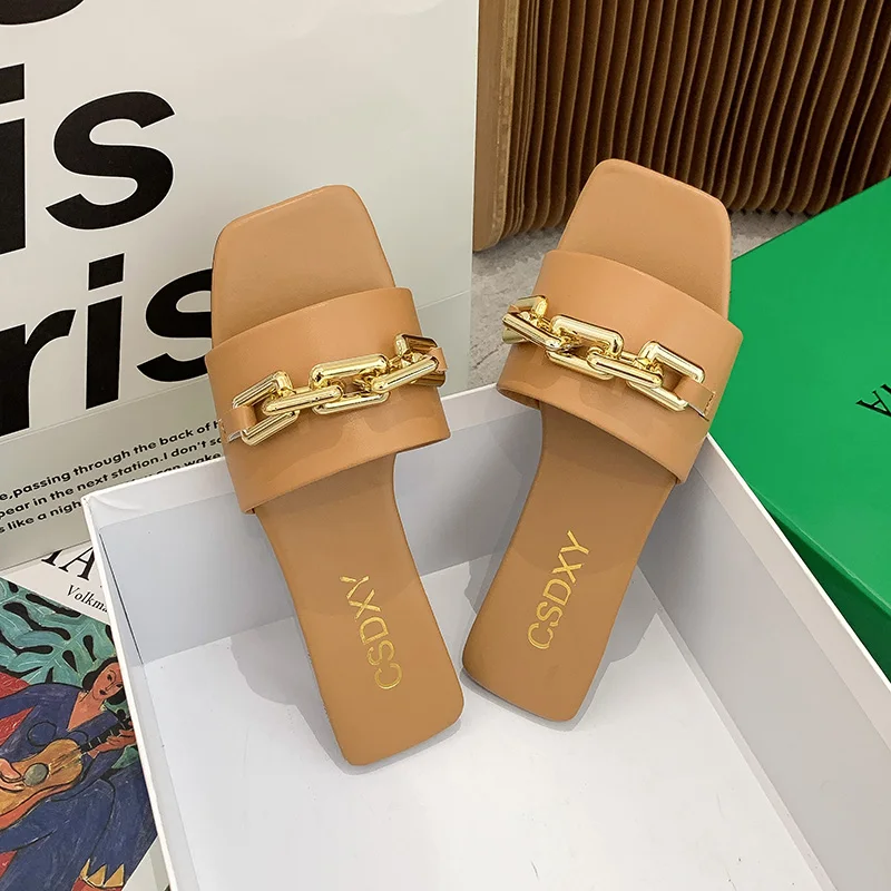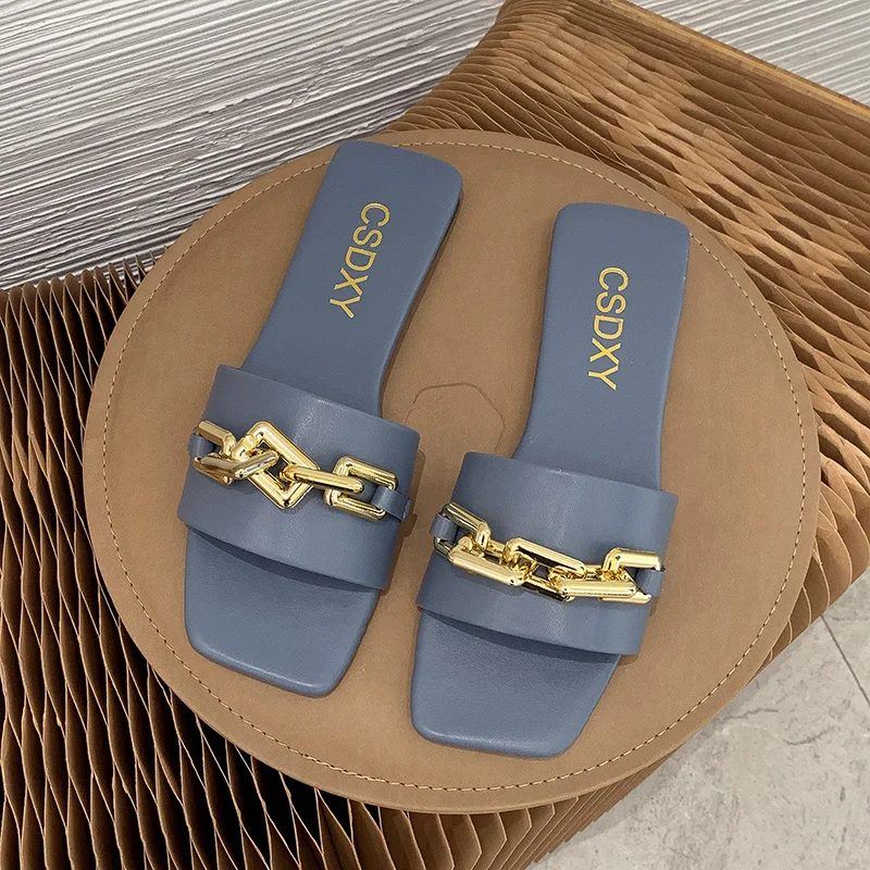Женские шлепанцы, лето 2021, металлическая цепочка, Роскошные, с квадратным носком, на плоской подошве, женские размера плюс, уличные, пляжные, удобные сандалии
