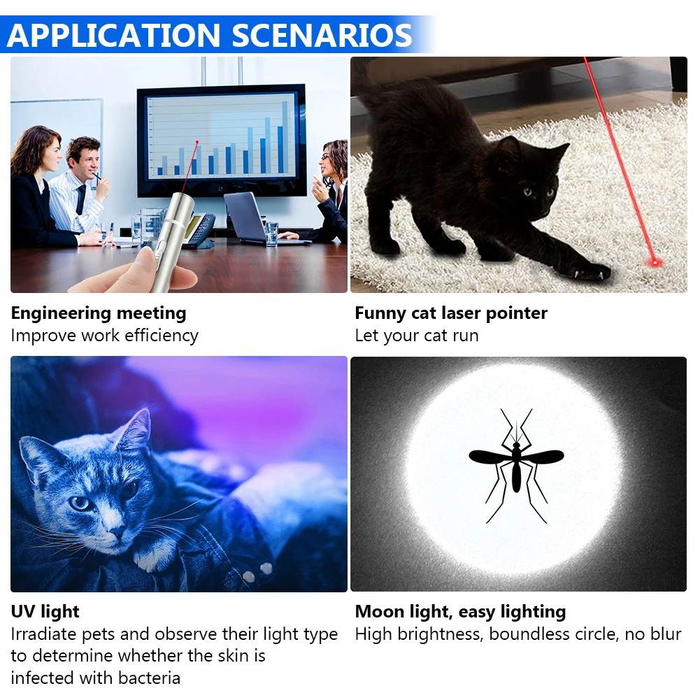 Широкий спектр применения. Используется для развлекательных игрушек для домашних животных, кошек и собак, для гида, классных и деловых презентаций, пеших прогулок или активного отдыха. УФ-детектор может использоваться для обнаружения фальшивых денег, мочи для собак, пятен домашних животных и т. д. это также удобный фонарик, когда ночью читает и работает, аварийное освещение дома.