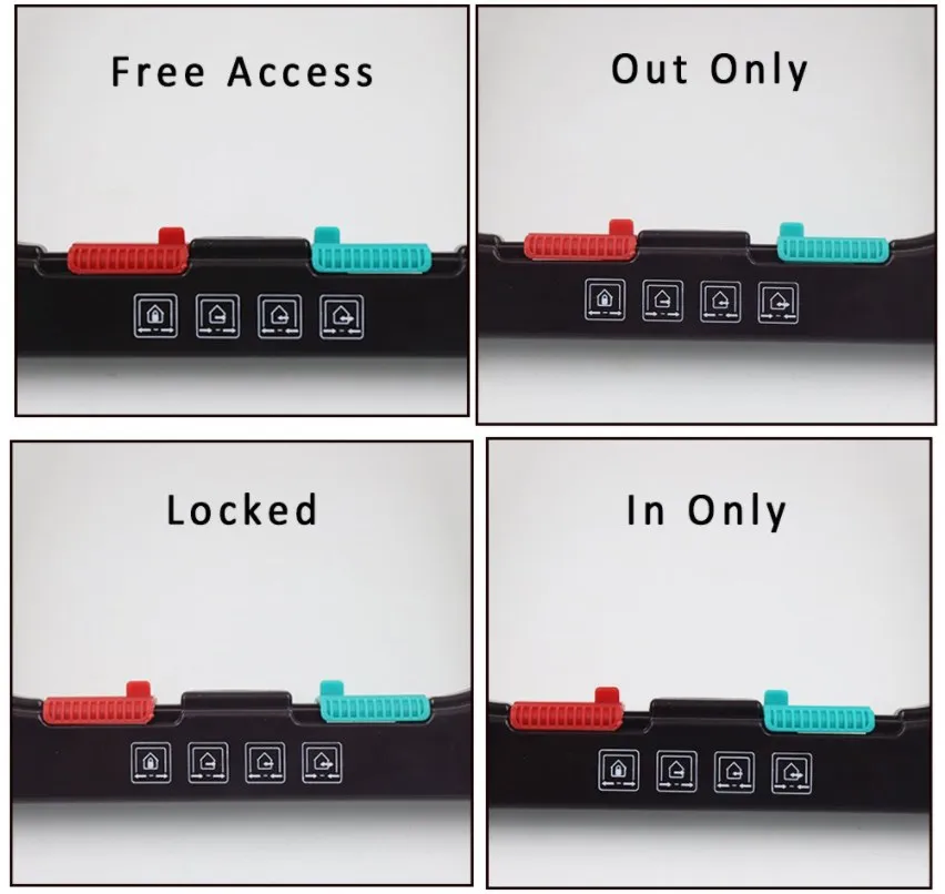 3. Поверните красные и зеленые переключатели на левую сторону, Питомцу разрешается выходить из дома, но предотвращает вход в дом.