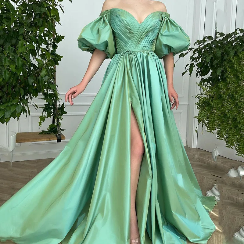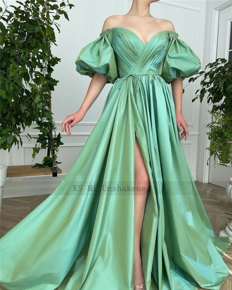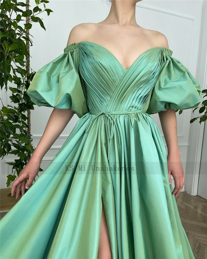 Зеленые атласные длинные вечерние платья, женское кутюрное платье с пышными короткими рукавами, платья для выпускного вечера с разрезом, одежда для вечеринки, платье для вечеринки