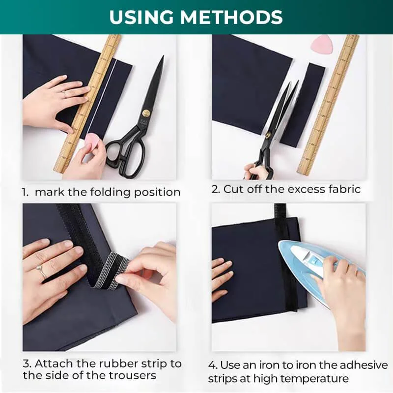 Укороченные длинные брюки без усилий!Гладкий, клей для легкой и долговечной набивки одежды и домашнего декора без шитья. Нужно только отрезать более длинную часть брюк, затем приклеить края брюк, укоротить самоклеющиеся на интерфейсе, и утюжить его назад и вперед несколько раз, чтобы установить форму!