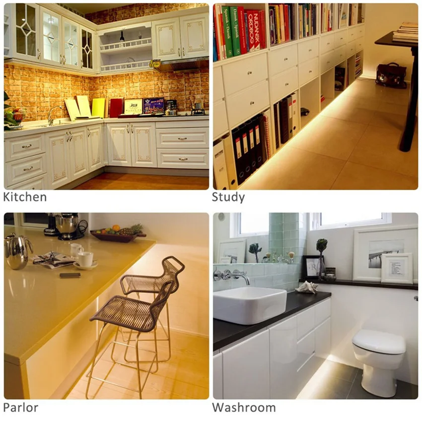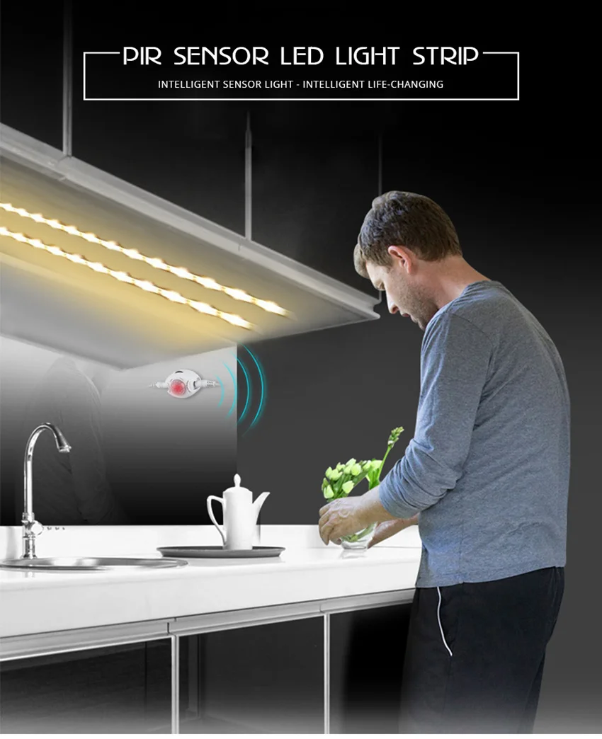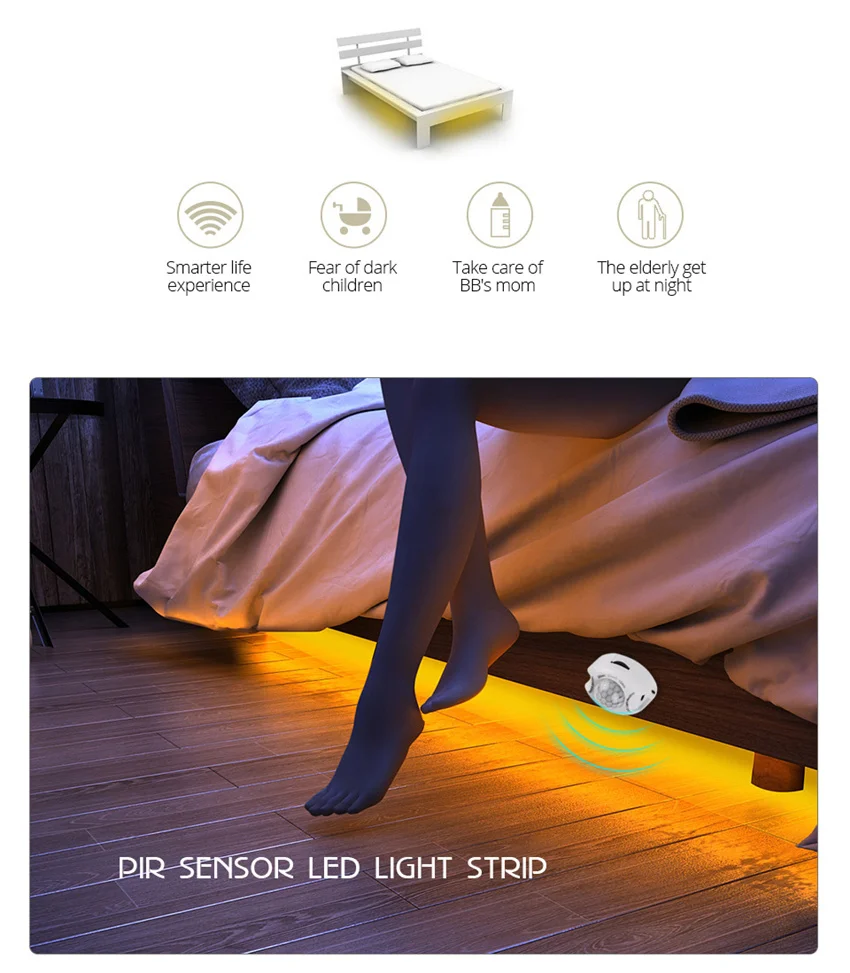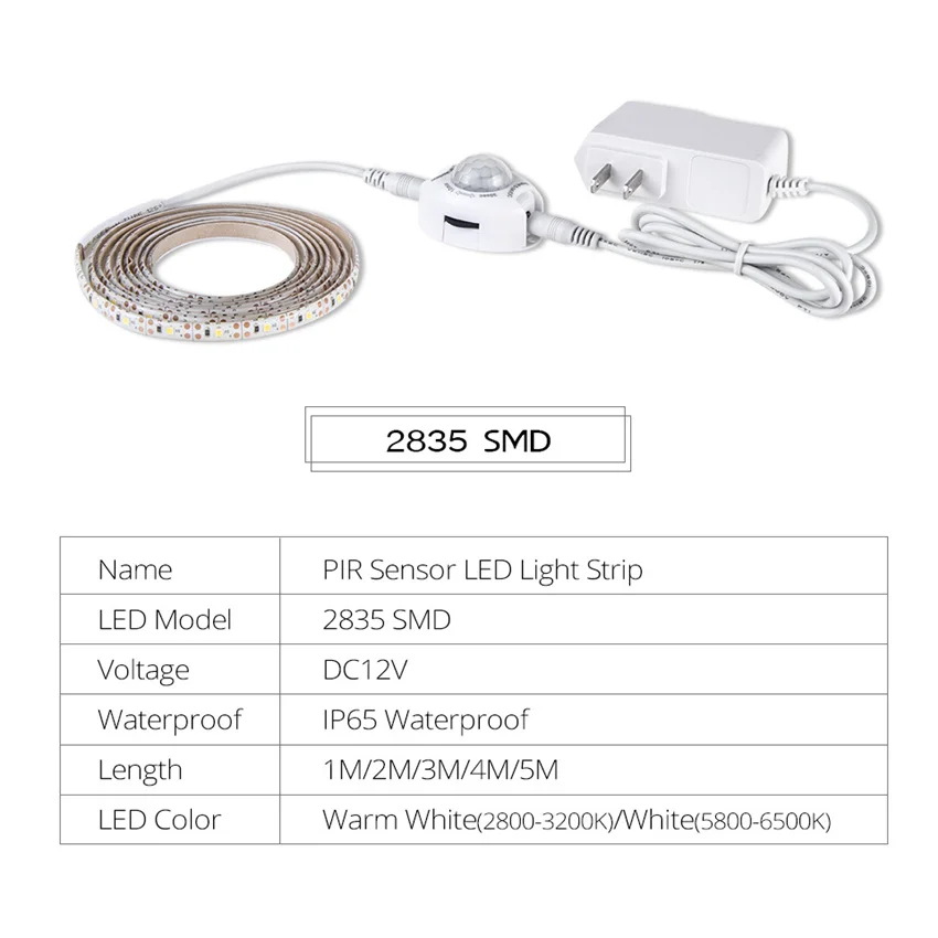 Характеристики: Тип: светодиодный Ночной светильник с датчиком движения Сенсор Датчик: ИК-датчик движения тела и светильник Тип светодиодов: 2835 SMD Источник питания: 12 В постоянного тока адаптер питания Светильник Цвет: белый/теплый белый Цветовая температура: белый (6000k-6500K); Теплый белый (2700K-3500K) Расстояние срабатывания: 1 м-3 м Время задержки: 30 сек-10 мин (регулируется) Длина светодиодной ленты: 1 м/2 м/3 м/4 м/5 м Количество светодиодов: 60 светодиодов/м Класс водонепроницаемости: IP65 Примечания: Режим управления светильник: этот элемент может работать только на ночной Светильник или темную среду. Умный датчик PIR, автоматическое включение при обнаружении движения человека в темной среде, может регулировать время, чтобы выключить свет. Обычно можно использовать под освещением кровати, также широко для кухни, лестничного выхода, спальни, санузла, шкафа и т. Д.