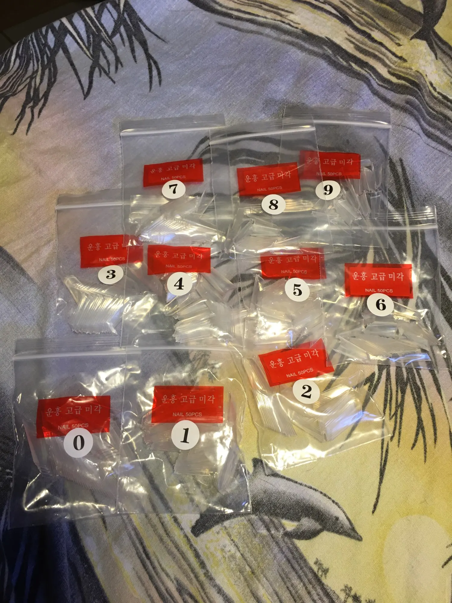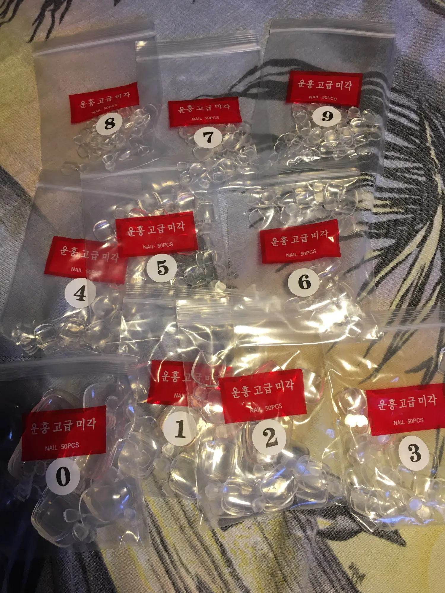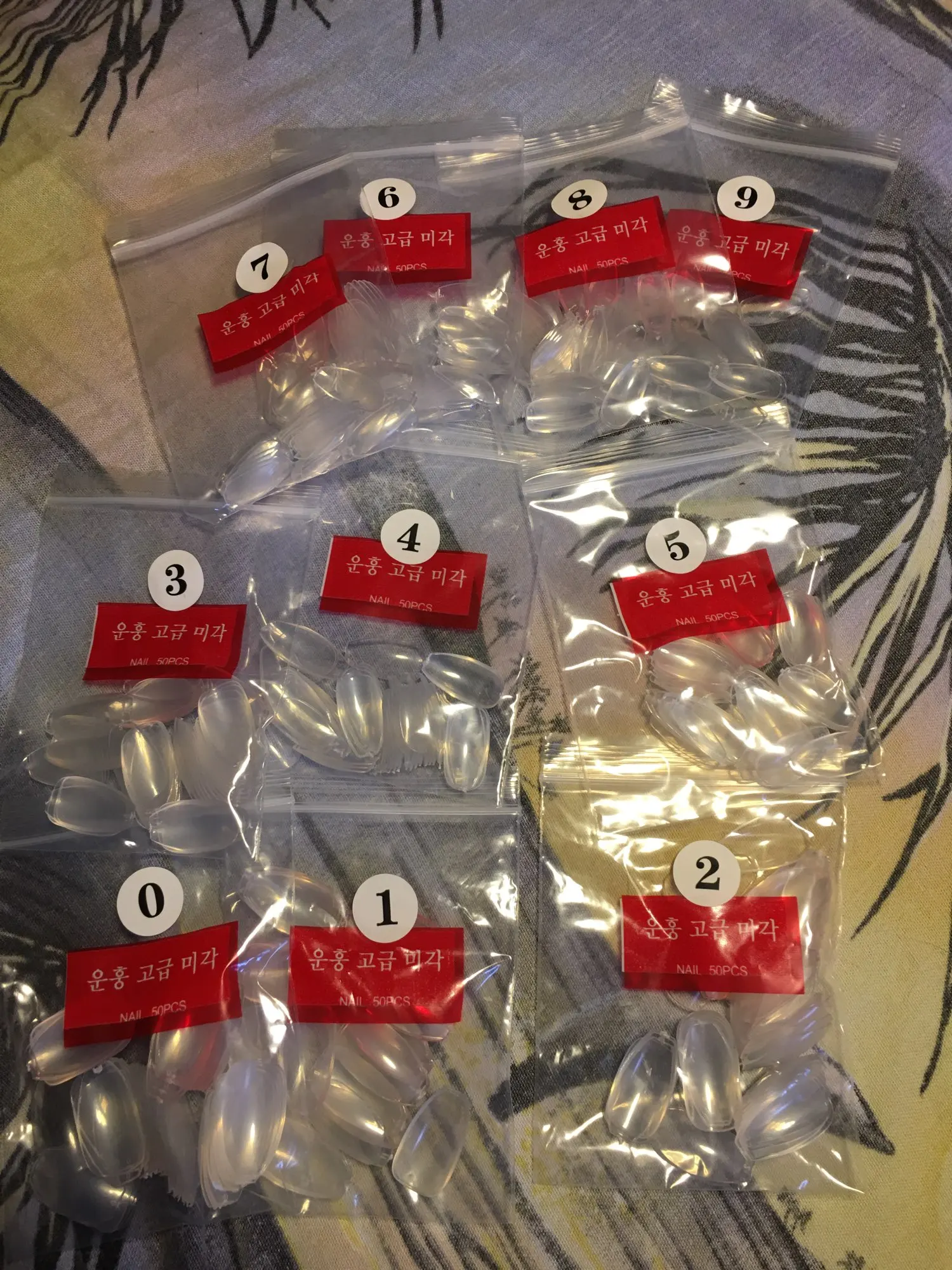 Поштучно не пересчитывала, но самих пачек 10, все подписаны по номерам. в каждой упаковке лежит по кучке ногтей. по размеру ногти не все подходят, не моего формата, нужно подбирать. По качеству ногти плотные, крепкие. Еще не клеила, поэтому не могу сказать, как будут держаться. Посылка очень быстро дошла, впервые за такое короткое время - 27 августа заказала, а 8 сентября уже получила. Довольна.