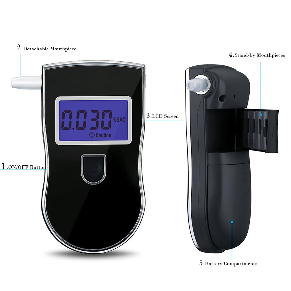 Особенности:1. Профессиональный дизайн дыхательных путей2. Синяя подсветка, 3 номера, светодиодный дисплей3. Быстрый ответ и восстановление4. 3 единицы тестирования на выбор5. Громкий звуковой сигнал6. С функцией автоматического энергосбережения и отключенияПараметры:Датчики: высокочувствительные полупроводниковые датчики.Время разогрева: 20 сВремя реакции: 5SДиапазон измерения: 0,000-0.199% BAC & 0,000-1,990 ‰ BAC & 0,000-0,995 мг/лТочность: ± 0.010% BACРабочий ток: ≤ 120 мАРабочее напряжение: 3 секции батареек ААА (не соответствует продукту)Меры предосторожности:1. Пожалуйста, Пройдите тест через 20 минут, потому что впитывание алкоголя из пищеварительной системы в кровь занимает около 20 минут. Если у вас есть тест немедленно, результаты могут отражать только концентрацию алкоголя во рту, а не концентрацию алкоголя в крови.2. Чтобы получить точные результаты теста, пожалуйста, подождите 20 минут после выпивки, лучше подождать более 3 минут, когда вы получите другой тест.3. Курение и прием пищи запрещены за 20 минут до теста.4. Не протирайте изделие химическими веществами или коррозионным раствором, чтобы избежать попадания жидкости в воздушную трубку.5. Если тест на низком заряде батареи, то будут некоторые различия между значением теста и реальным значением.6. Запрещено хранить в окружающей среде краску, пестициды, спирт и другие агрессивные газы или загрязнение воздуха.7. Несанкционированный ремонт и повреждение внутренних деталей приведут к поломке продукта.Если у вас есть тест сразу после выпивки, значение может быть относительно выше, но тест пройдет через 20-30 минут, значение может быть уменьшено, но это значение более точное, потому что алкоголь был поглощен через пищеварение в кровь в то время.Теоретически, человек пьет 350 мл (около 1 бутылки) пива или 20 мл белого вина, концентрация алкоголя в крови может достигать 20 мг/100 мл; когда количество спирта достигло 1400 мл (около 3 бутылок емкостью 500 мл) пива или вина 80 мл, Концентрация алкоголя в крови может достигать 80 мг/100 мл. Результаты данных могут быть не столь точными, так как емкость разложения отличается для разных людей.Согласно докладу Всемирной организации здравоохранения: Когда концентрация алкоголя в водительской крови составляет до 80 мг/100 мл, вероятность дорожно-транспортных происшествий составляет в 2,5 раз больше людей, не имеющих алкоголя. Когда концентрация алкоголя в водительской крови составляет до 100 мг/100 мл, вероятность дорожно-транспортных происшествий составляет в 4,7 раз больше людей, не имеющих алкоголя.
