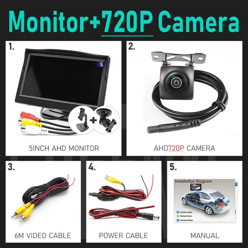 1 x 5-дюймовый монитор AHDКамера траектории AHD-1 шт.1x6 м видеокабельКабель питания 1,5 м-1 шт.1 x саморез1 x регулировка угла