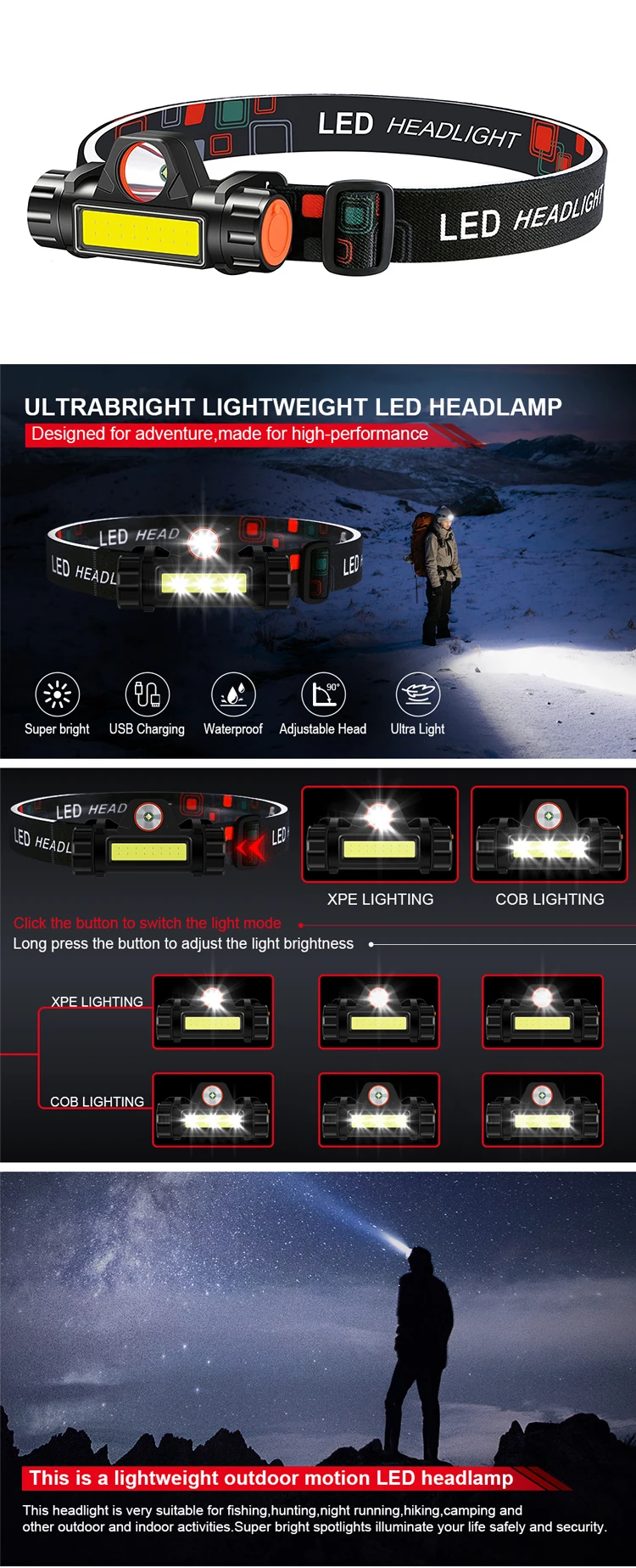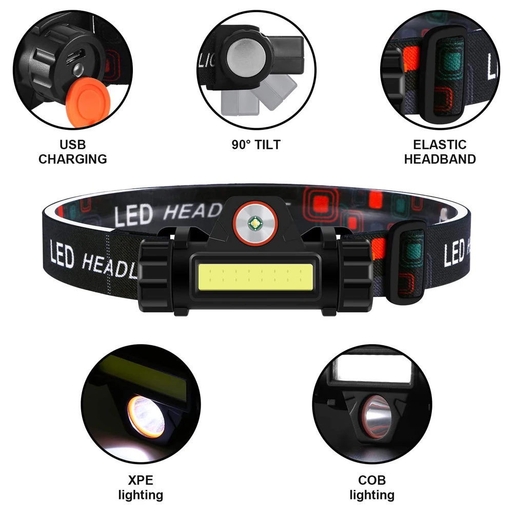 Зарядка через USB мини-фонарик светодиодный налобный фонарь XPE + COB USB Перезаряжаемый налобный фонарь встроенный аккумулятор водонепроницаемый налобный фонарь