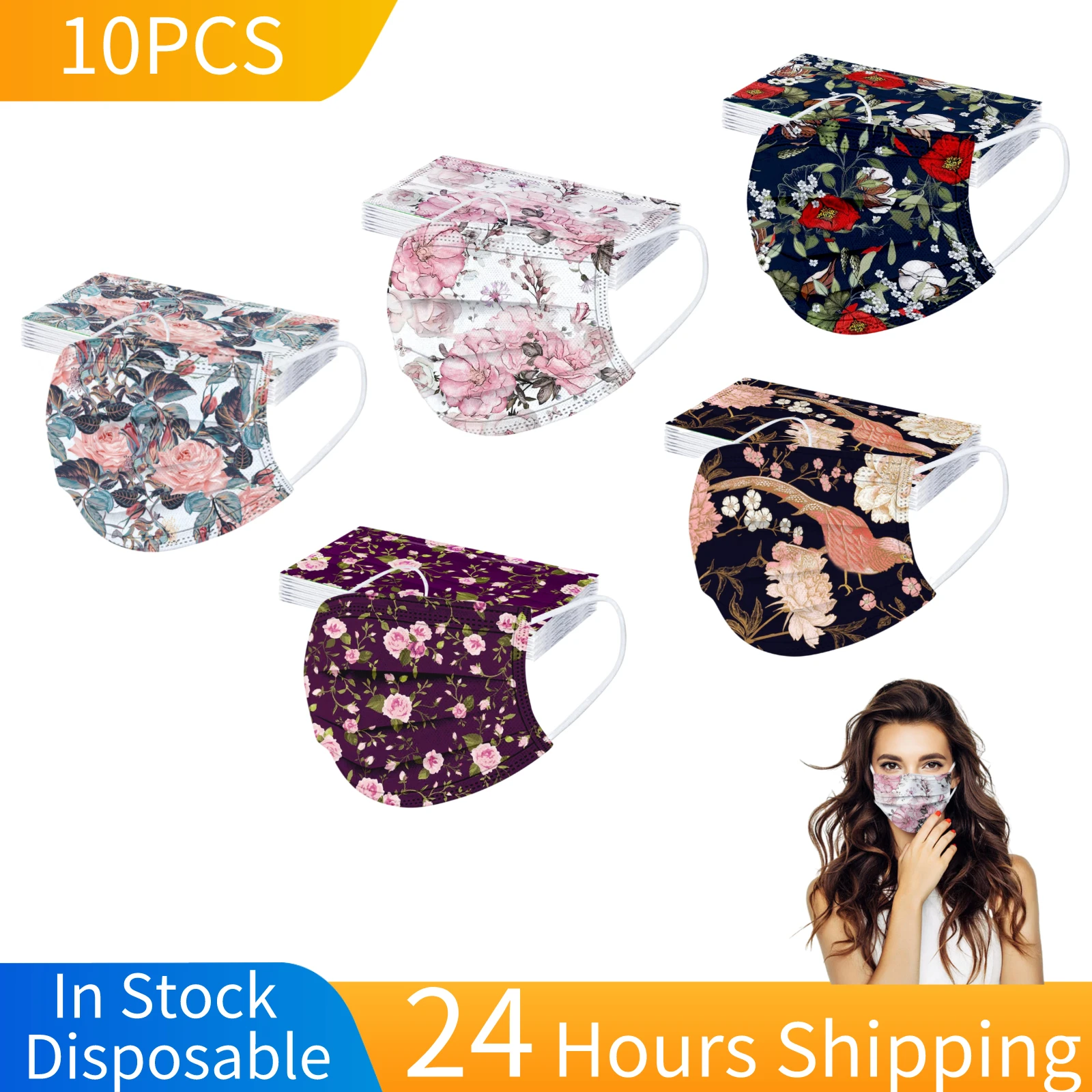 Маска одноразовая для взрослых с цветочным принтом, безопасная 3-слойная дышащая маска для лица, 10 шт.