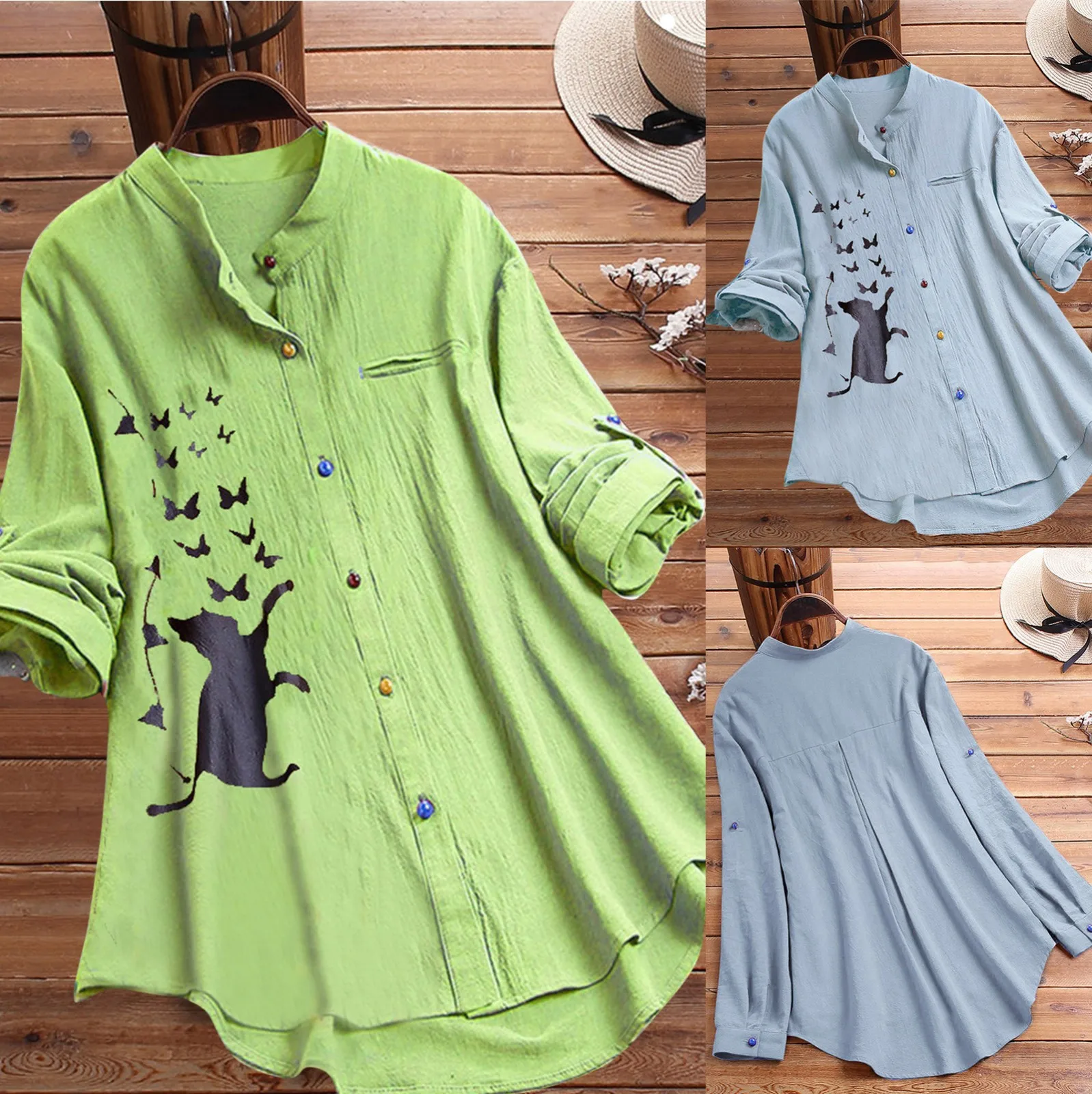 Женская блузка с принтом в виде кота, с длинным рукавом, на пуговицах, лето, размера плюс