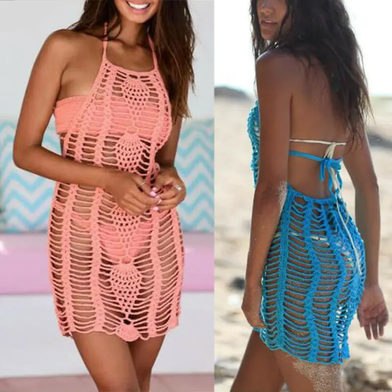 Сексуальное ажурное женское платье-накидка для бикини, однотонный пляжный сарафан на шнуровке, с лямкой через шею, пляжные покрывала