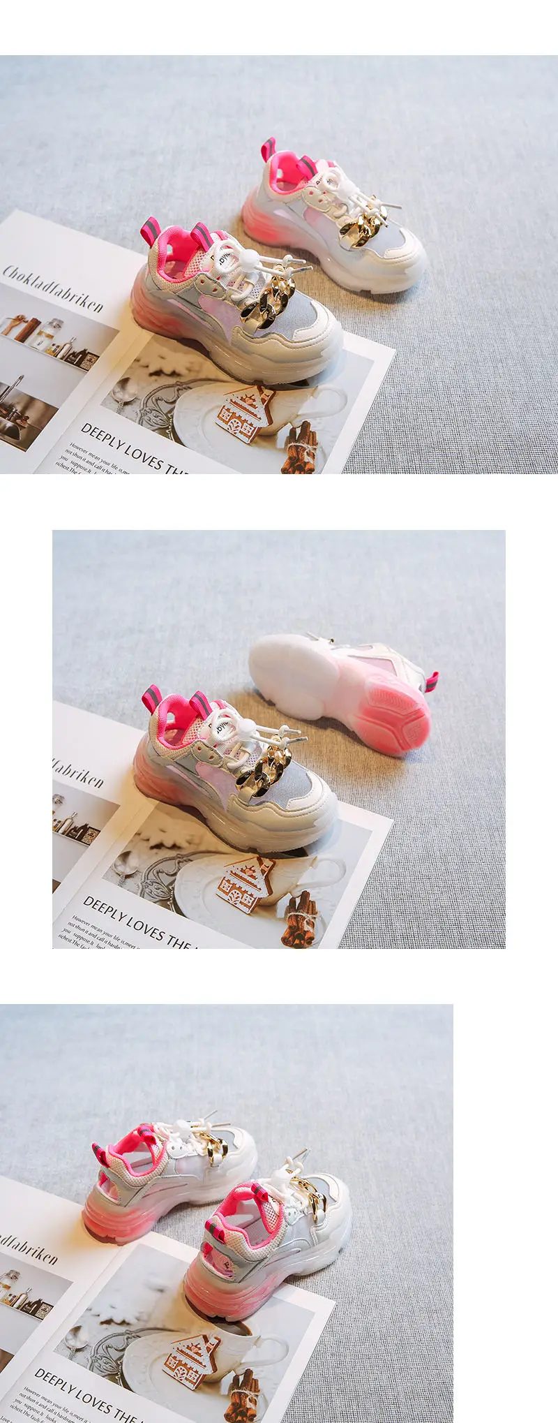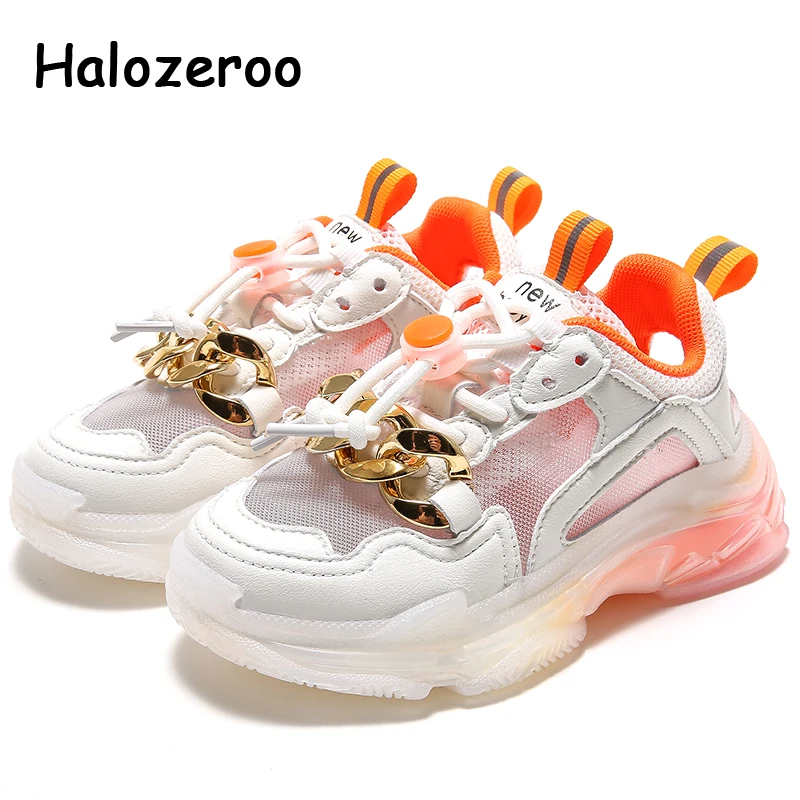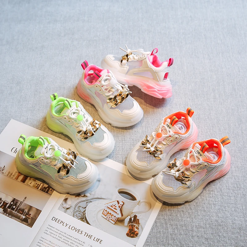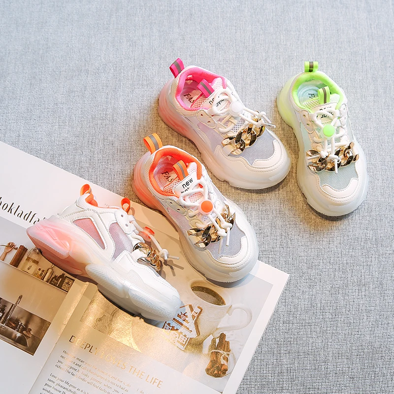 Новые осенние детские спортивные кроссовки для маленьких девочек; Брендовая обувь с цепочкой; Детские повседневные кроссовки из сетчатого материала; Кроссовки без застежки для мальчиков