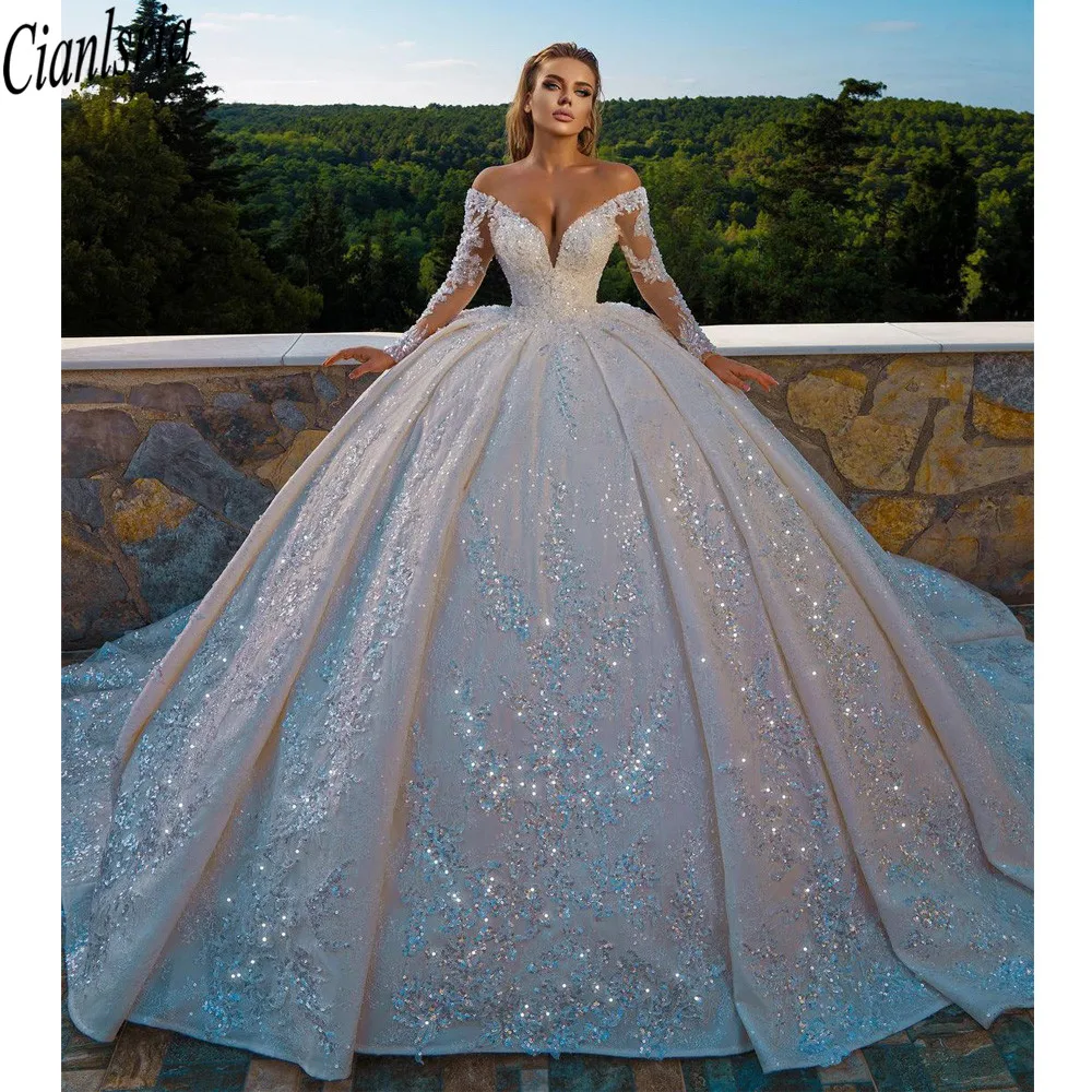 Соблазнительные церковные Свадебные платья с V-образным вырезом, длинные Блестящие Блестки, бусины, свадебное платье для невесты, искусственные оборки 2021