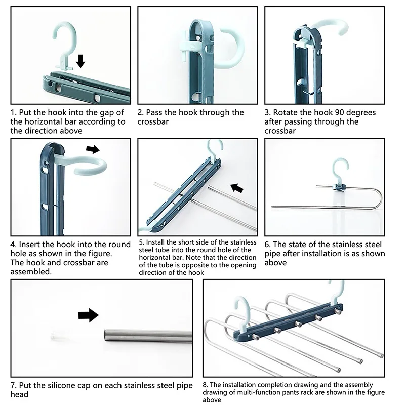 * Шаги по установке: Поместите крючок в зазор перекладины; Пропустите перекладину; Поверните крючок на 90 градусов после прохождения перекладины; Вставьте крючок в круглое отверстие, И крюк и перекладина собраны; Установите короткую сторону трубки из нержавеющей стали в круглое отверстие поперечного стержня, обратите внимание на направление трубы, противоположное направлению открытия крючка; положите силиконовую крышку на каждую головку трубы из нержавеющей стали; Установка завершена.