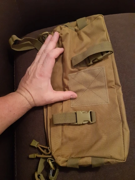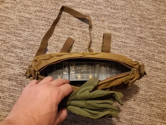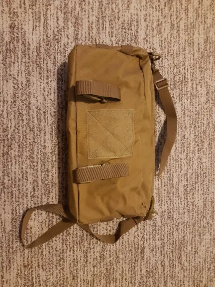 Приехало быстро. Сам подсумок оказался больше чем я думал, и его можно использовать как самостоятельную мини сумку.. У меня в него влазит 3 пачки патронов по 25 штук, перчатки, очки, жгут, ИПП.. Швы ровные, внутри обработаны окантовочной лентой, коржура ближе в 1000, фастексы на троечку, но они нагрузки не имеют, только фиксация сумки когда она свернута. Есть плечевой ремень, короткий, но есть.