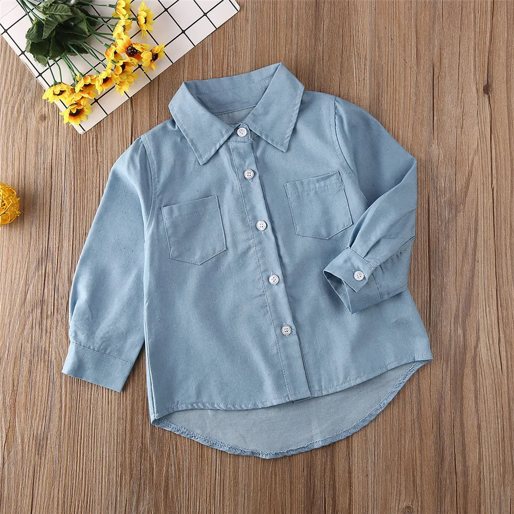 Детская джинсовая рубашка, с длинным рукавом и буквенным принтом, осенняя, теплая, синяя, От 2 до 7 лет