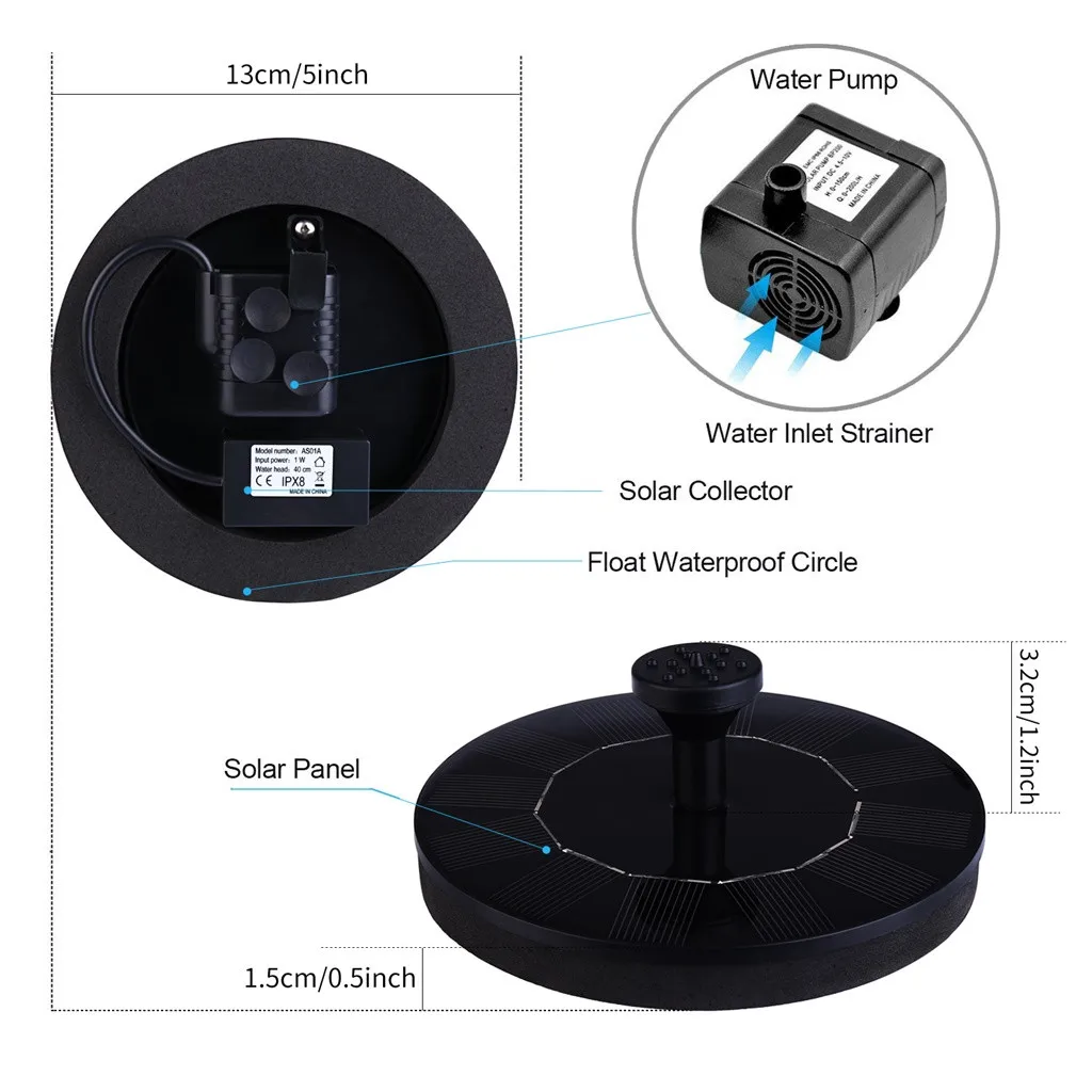 В Солнечный пруд насос начнет автоматически через 3 секунды при ярком солнечном свете. Максимальное количество потока насоса: 160 л/ч, максимальная высота воды насоса: 100 См, максимальная высота струи воды: 45 см