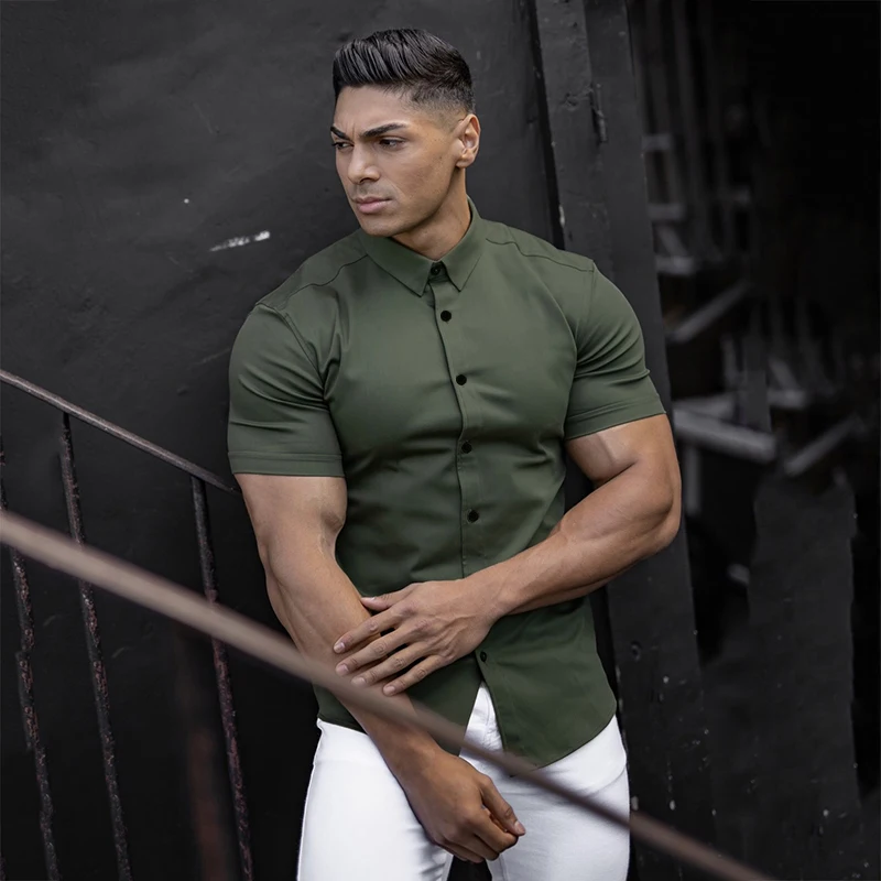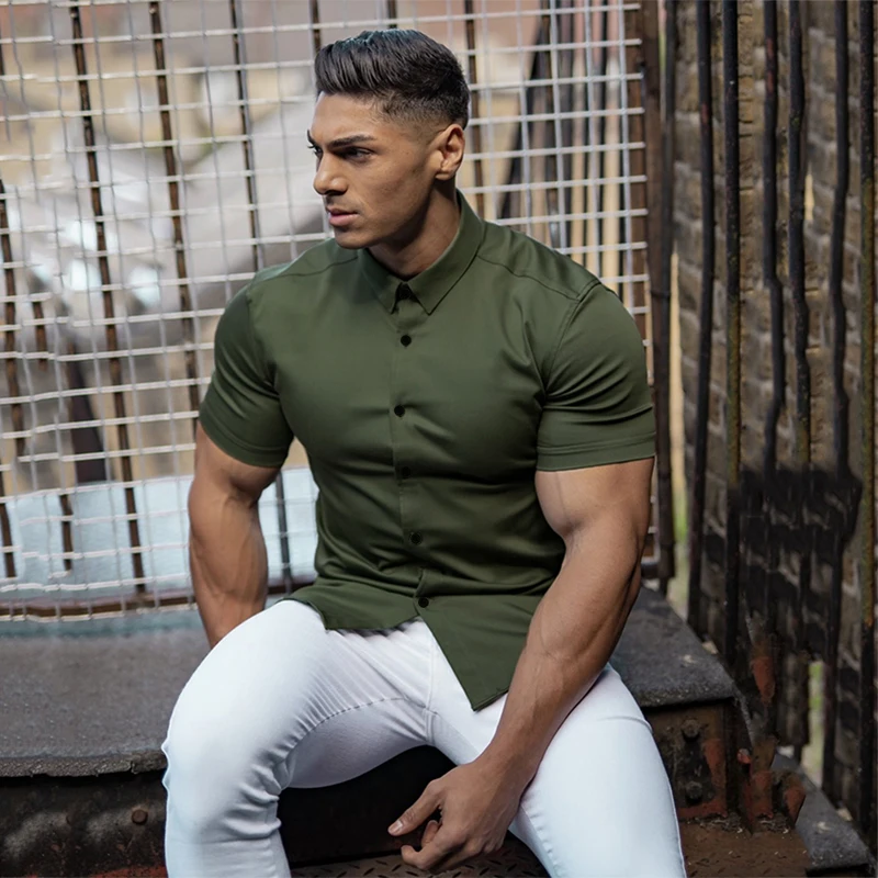 Мужская одежда, летняя спортивная рубашка для фитнеса на пуговицах с коротким рукавом, Мужская модная повседневная Уличная рубашка, Мужская хипстерская рубашка