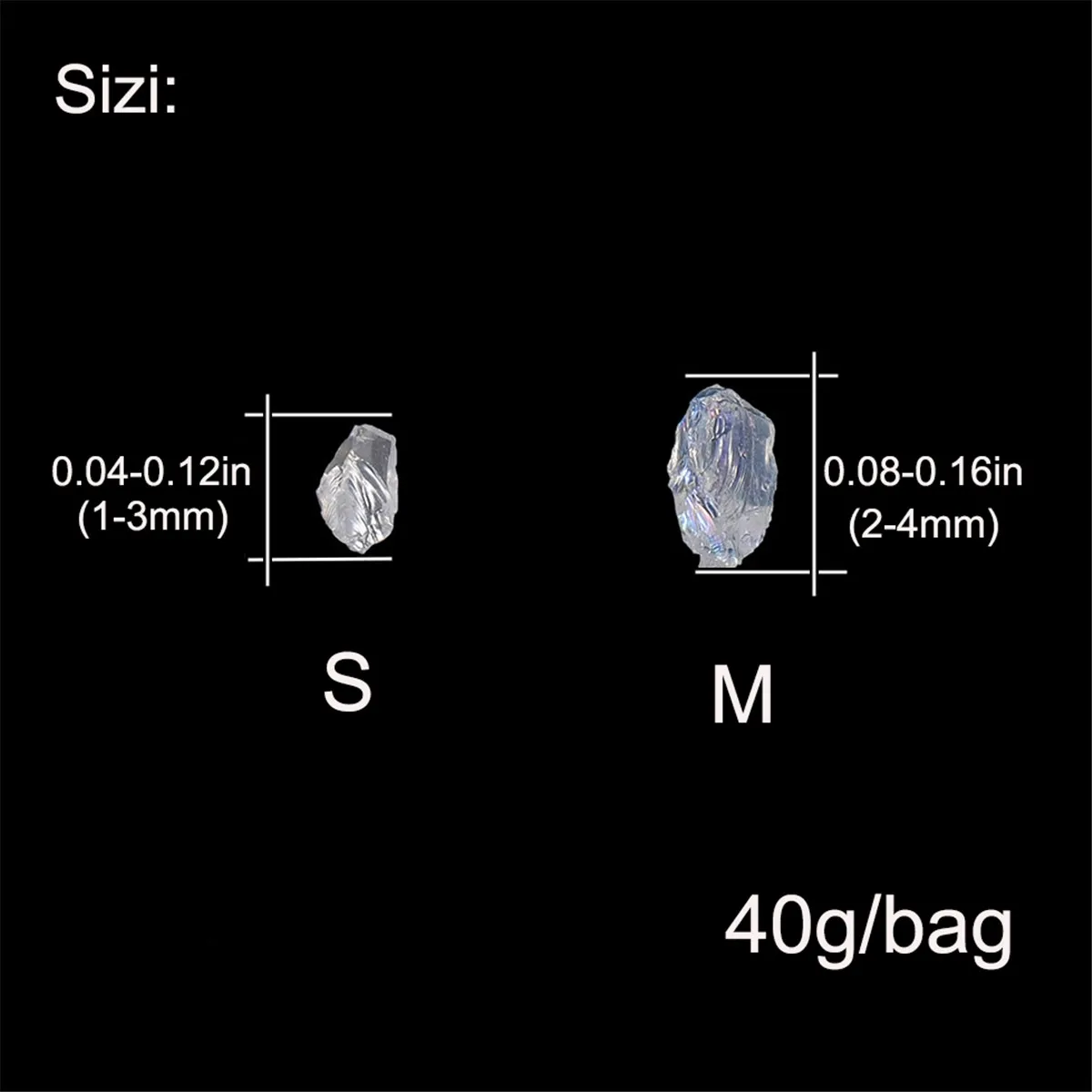 Размер:Нестандартные дробленые стеклянные блестящие маленькие крошечные чипы, размер одного составляет около 1-3 мм; Вы получите 40 г (1,41 унций) металлическое дробленое стекло, достаточно для использования и удовлетворения ваших различных потребностей в украшениях