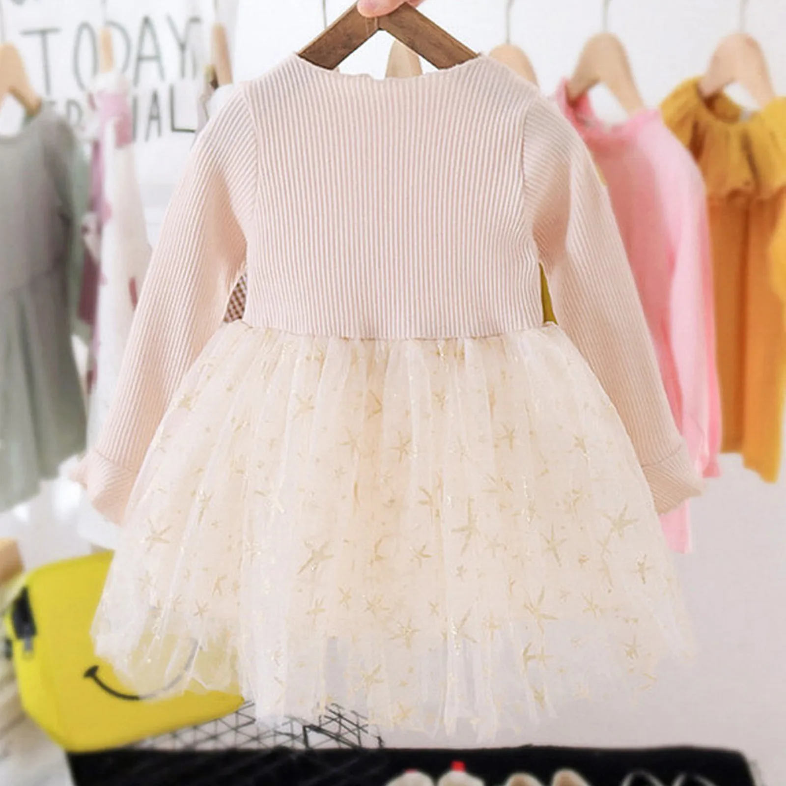 Платья для новорожденных девочек, модное осенне-зимнее платье для маленьких девочек в стиле пэчворк с рисунком звезд, наряды из тюля с круглым вырезом и длинным рукавом