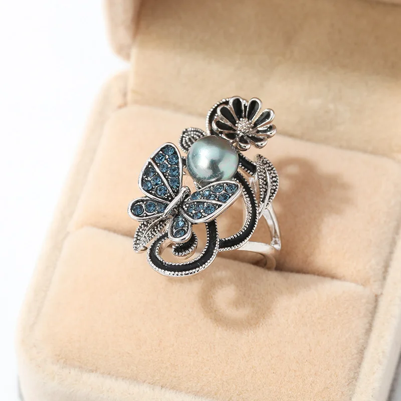 Женское кольцо с жемчугом и бабочкой, Винтажное кольцо серебряного цвета с синим кубическим цирконием и инкрустацией в стиле ретро, Подарочная бижутерия для коктейвечерние