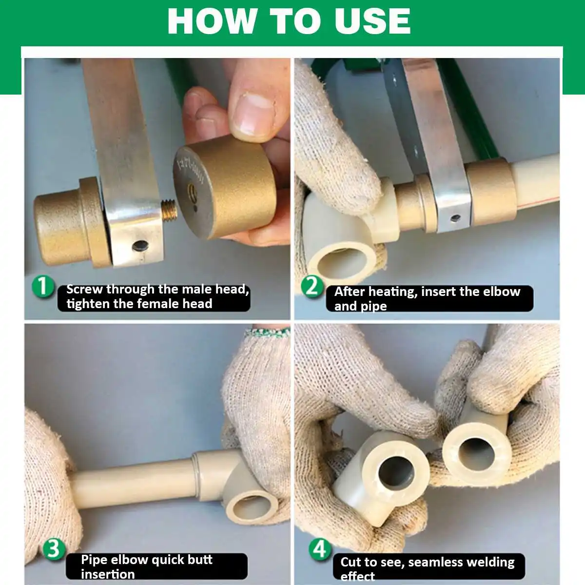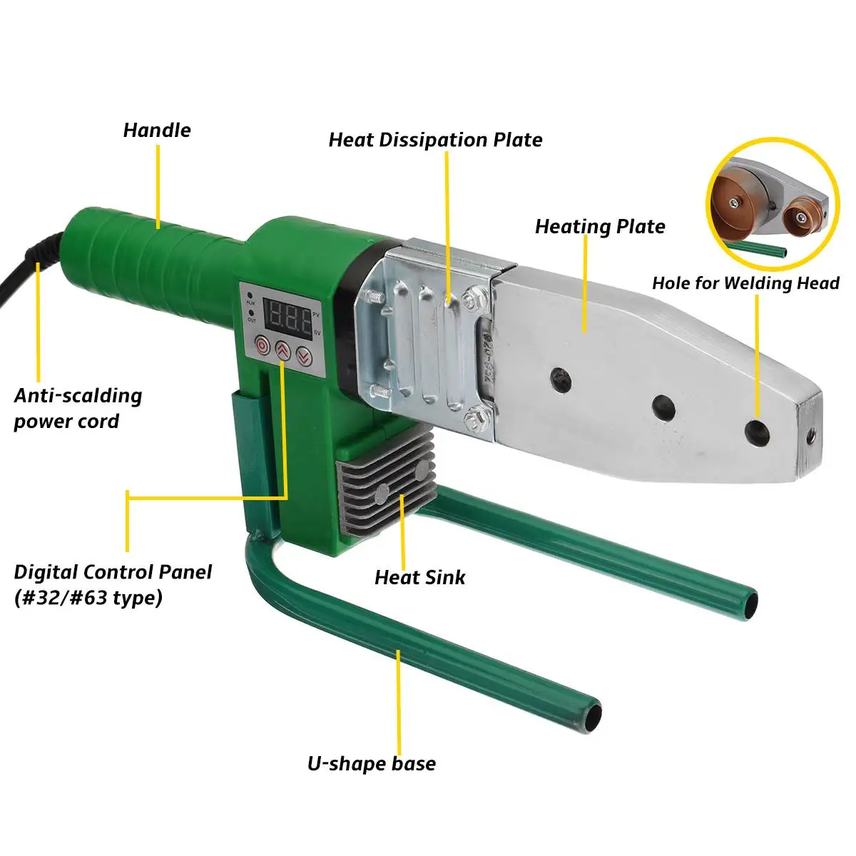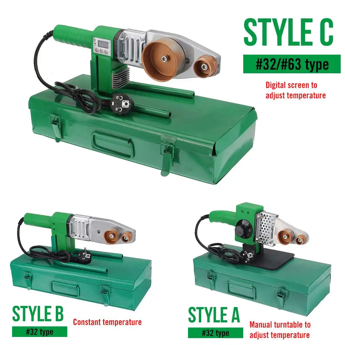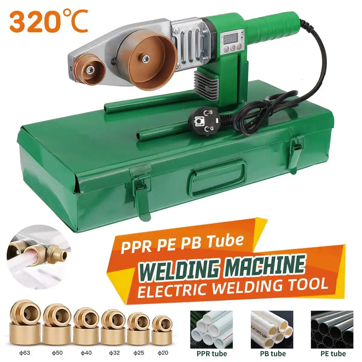 Спецификация типа #32Материал: АБС-пластик + алюминийЦвет: зеленыйСтиль: A, B, CПодходит для: труб PPR / PB / PEТемпература нагрева: 320 ℃Сварочная головка: 20 мм/25 мм/32 ммНапряжение: 220 В (убедитесь, что он подходит для вашего местного стандарта напряжения!)Тип вилки: вилка европейского стандартаПосылка входит1 х сварочный аппарат для труб3 x сварочная головка1 х ящик для хранения1 х Руководство пользователяПосылка входит B1 х сварочный аппарат для труб3 x сварочная головка1 х ящик для хранения1 х Руководство пользователяПосылка входит C1 х сварочный аппарат для труб3 x сварочная головка2 винта1 х гаечный ключ1 х ящик для хранения1 х Руководство пользователяСпецификация типа #63Материал: АБС-пластик + алюминийЦвет: зеленыйСтиль: CПодходит для: труб PPR / PB / PEТемпература нагрева: 320 ℃Сварочная головка: 20 мм/25 мм/32 мм/40 мм/50 мм/63 ммНапряжение: 220 В (убедитесь, что он подходит для вашего местного стандарта напряжения!)Тип вилки: вилка европейского стандартаПосылка входит1 х сварочный аппарат для труб12 сварочных головок (20 мм/25 мм/32 мм/40 мм/50 мм/63 мм)2 винта1 х гаечный ключ1 х ящик для хранения1 х Руководство пользователяОсобенности-Предназначен для длительного использования.-Нескользящая ручка, удобно держать.-Подходит для трубопроводной строительной техники.-Для сварки труб PPR / Pb / PE, таких как пластиковые трубы и так далее.-U-образная конструкция основания увеличивает несущий эффект и стабильно работает.-Расширенная и утолщенная панель для сохранения тепла и быстрого плавления трубки.-Двухсторонняя конструкция теплоотвода, без перегорания в течение длительного времени.-Утолщенная теплоизоляция, опаленное дерево, полипропилен, Двойная теплоизоляция, стабильное тепловыделение.Инструкция1. Установите радиатор на фиксированное сварочное устройство, поместите сварочное устройство на стойку, установите соответствующий нагревательный штамп в соответствии с требуемыми спецификациями труб и затяните гаечный ключ, обычно маленькие в передней части сзади.2. Включение: Включение питания (обратите внимание, что питание должно быть с линией защиты от заземления), зеленый индикатор светильник пока зеленый светильник не выключен, красный светильник горит, указывая, что предохранитель переходит в состояние автоматического контроля температуры, вы можете начать работу. Примечание: в режиме автоматического контроля температуры Красный светильник, зеленый светильник будет поочередно гореть, указывая на то, что предохранитель находится в контролируемом состоянии, не влияет на работу.3. Сварная труба: труборез с прямым отрезком трубы, трубы и трубы одновременно без вращения в плашку предохранителя, и в соответствии с требованиями таблицы для работы, К времени нагрева сразу после того, как труба и труба удалены из штампа одновременно, Быстро и без вращения прямо на требуемую глубину равномерного, так что соединения раскрываются в равномерный фланец.