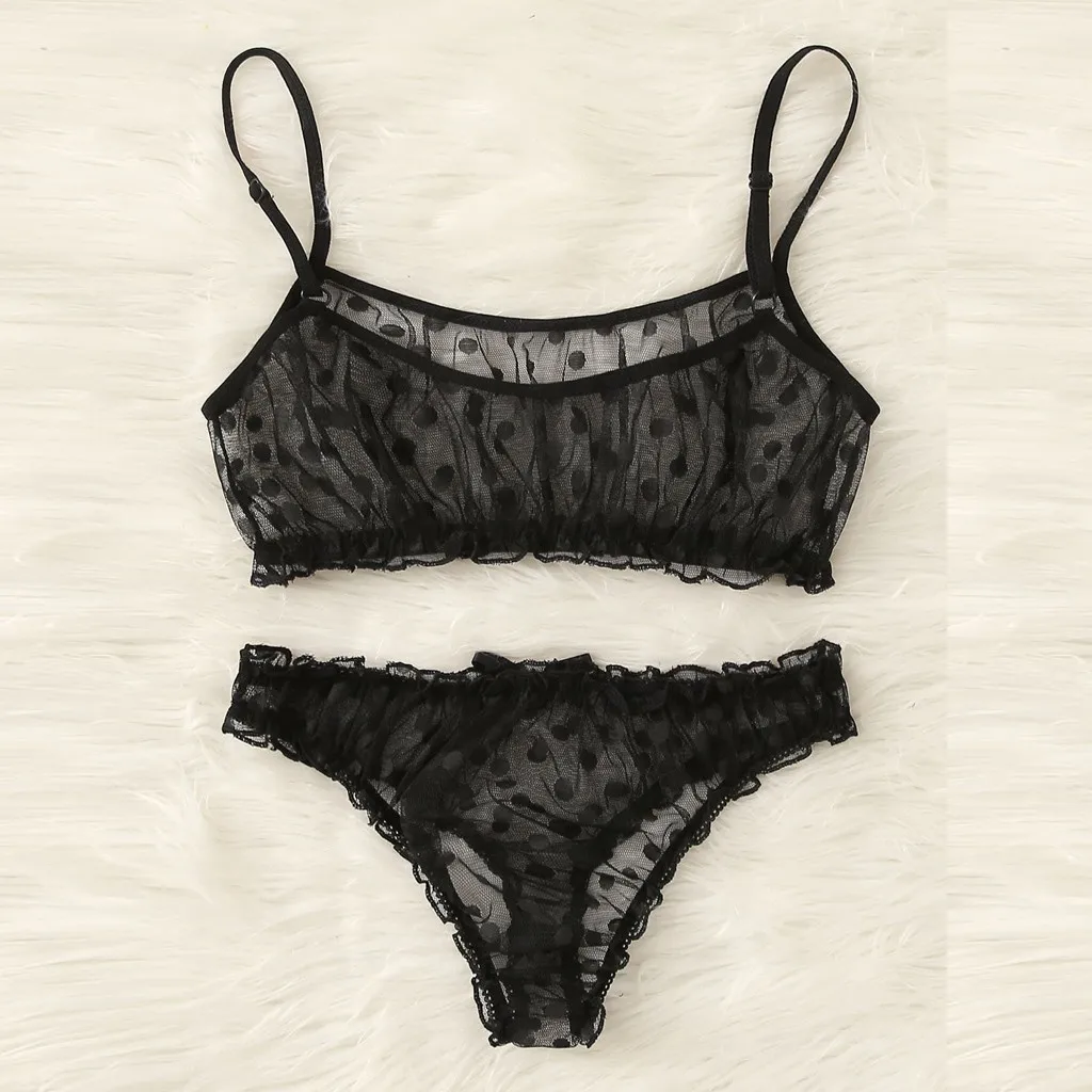 Новый женский сексуальный сетчатый бюстгальтер в горошек с бантом, Ночное нижнее белье, черный комплект нижнего белья, S-XL