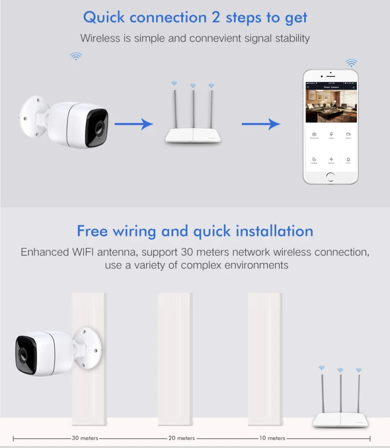 Простое подключение к Wi-Fi, простая установка в помещении или на открытом воздухе, простая настройка и настройка с помощью приложения.