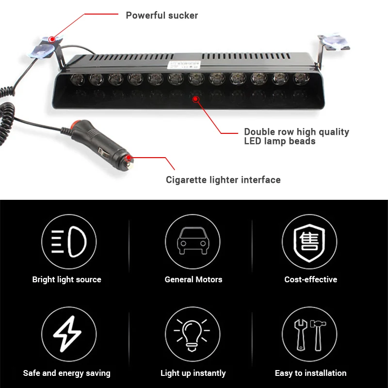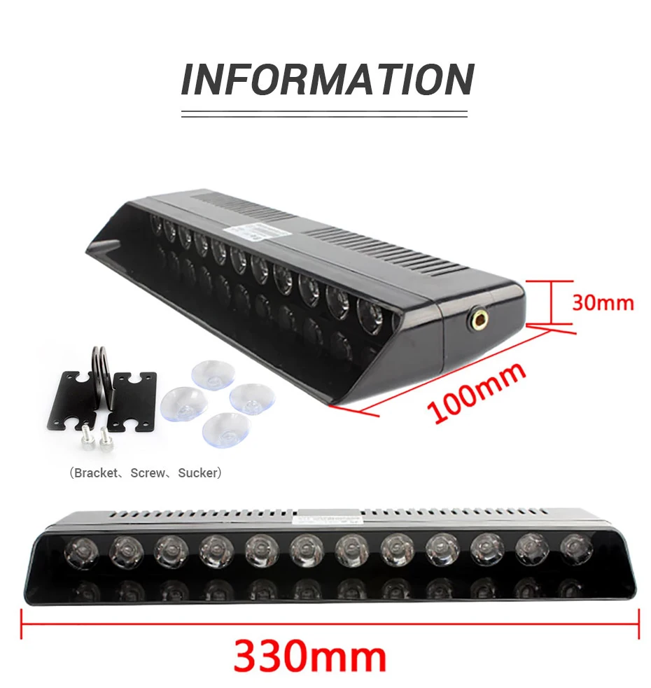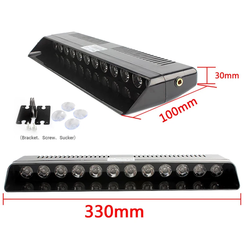 Комплект светодиодных аварийных сигнальных огней 12 В, Стробоскопическая световая полоса для автомобиля, грузовика, сигнальная полоса, подходит для внутреннего переднего/заднего лобового стеклаХарактеристики:Мощность: 12 Вт; Рабочее напряжение: 12 В постоянного токаСветодиодный источник светильник: 12X1 ВтРежимы освещения: 14 режимов вспышкиСрок службы: 50000 часовРазмер: 33x10x3 (см), 12,99x3,94x1,18 (дюйм)Особенности:1. Высокая яркость-Материал корпуса высокой интенсивности и Регулируемый угол наклона. Уникальный большой объектив с мощсветодиодный Одом 12x1 Вт в качестве источника светильник, очень яркий даже в дневное время.2. 14 различных режимов: --- есть 14 различных мигающих стробоскопов, функция возврата/памяти последнего узора. За светильник есть кнопка режима, которая может переключать несколько режимов для удовлетворения ваших потребностей, разнообразный, изысканный и красивый внешний вид, супер яркий и ослепительный свет3. Простая установка:-легко устанавливается с 4 присосками и подключается к прикуривателю 12 В. Нет необходимости разрушать оригинальную схему, прикуриватель принимает питание (есть переключатель на прикуривателе) непосредственно на переднем или заднем стекле4. Широко используется Предупреждение об опасности, EMS, правоохранительных органов, первого ответчика, буксировки и спасения, пожарного, строительства, чтобы быть видимым на работе.