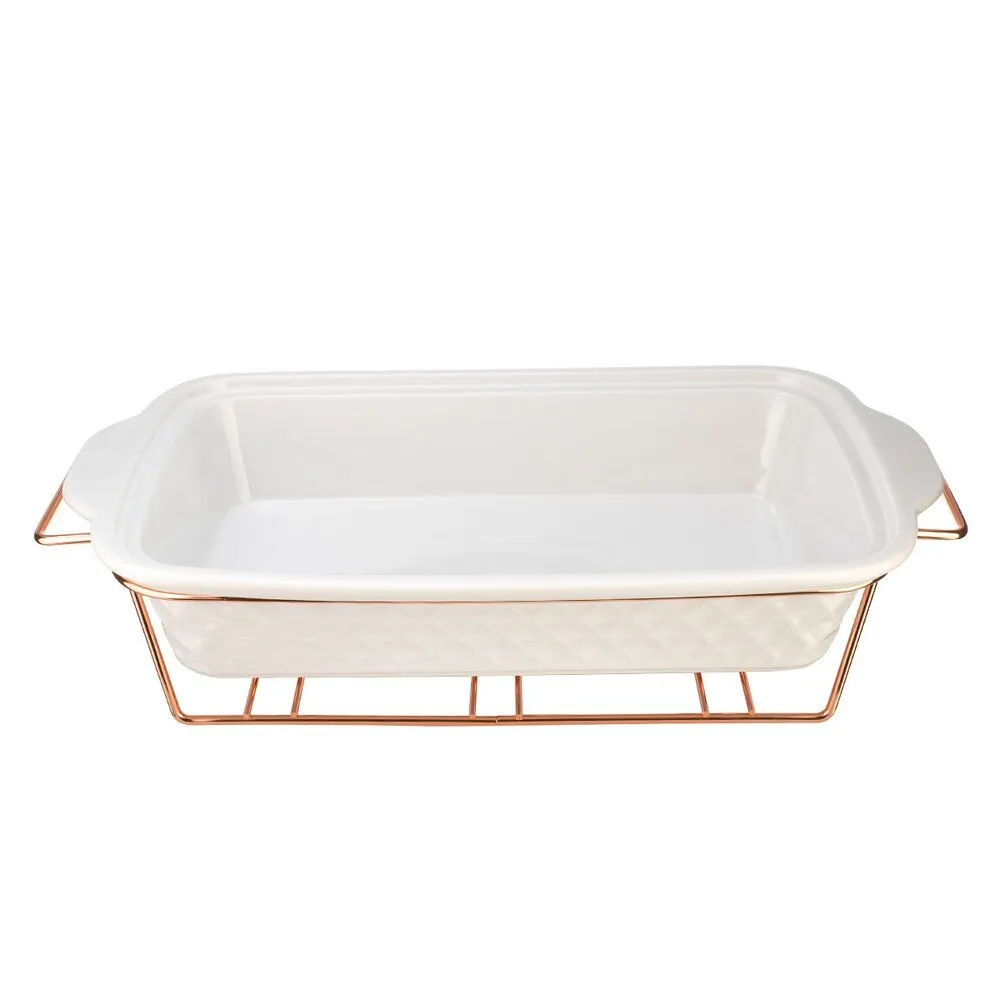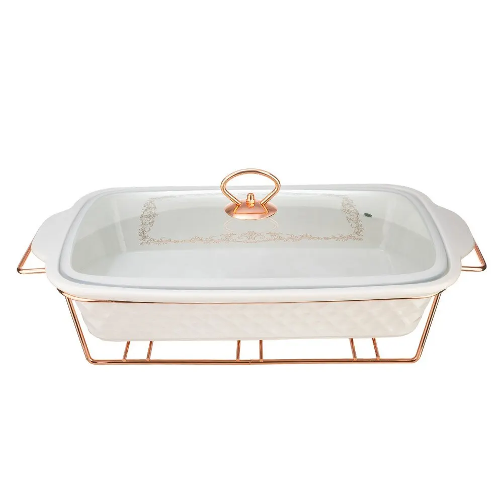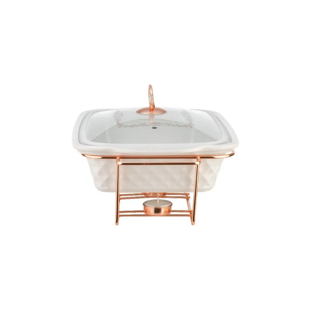 Прямоугольный мармит LARA из жаропрочного фарфора и устойчивой подставкой с отделкой розовое золото - идеальное решение для изысканой сервировки. Непрерывный подогрев от 3-х свечей сохранить блюдо горячим в течение 1-2 часов без потери вкуса. Идеально для вторых блюд и горячих закусок. Ёмксоть изготовлена из экологичного сверхбелого фарфора с фактурными внешними стенками. Все металлические элементы выполнены из стали с покрытием ROSE GOLD. Для крышки выбрали толстое высокопрочное стекло с паровыпуском, изящным декорированием деколью и силиконовым уплотнительным кольцом. Удобные длинные ручки помогут безопасно перенести мармит на стол.