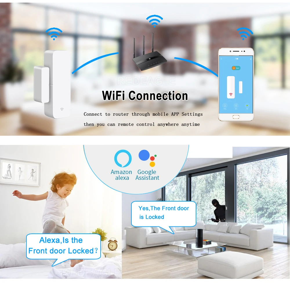 Совместимость с Alexa и Google Home:Просто используйте свой голос для управления подключенными устройствами Alexa или Google Home. Он также может выполнять автоматическое управление вместе с другими смарт-устройствами, которые совместимы с Умной жизнью. Удобно для обнаружения ваших дверей, окон, шкафов, ящиков или в любом месте, где вы хотите получить уведомление, когда он открыт или закрыт.Наслаждайтесь вашей умной жизнью:Когда вы выходите из дома, он будет направлять вам уведомление, когда дверь/Окно открывается или закрывается, так что вы можете обнаружить нарушителя вовремя. Кроме того, вы можете поделиться устройством с семьей и отслеживать историю деятельности датчика.Простота установки:Никаких сложных инструментов для установки не требуется. Датчик может быть установлен с двухсторонней клейкой лентой или винтами (в комплекте) всего за несколько шагов, И загрузите приложение «tuya» или «Smart Life» из магазина GooglePlay или app Store, чтобы добавить устройство для обнаружения состояния вашей двери/окна.Продукт включает:1 * Wifi датчик двери/окна(Без аккумулятора)Батарея: 2x AAA батарея(Не входит в комплект)