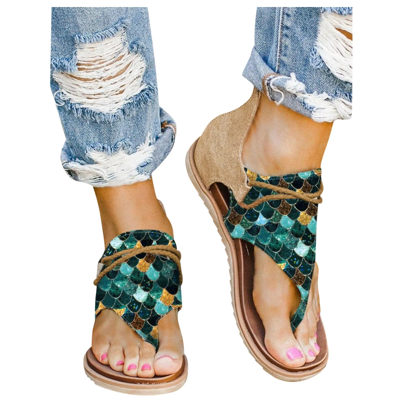 Летние женские сандалии на плоской подошве, шлепанцы на молнии, женская повседневная обувь, с принтом в виде рыбьей чешуи, с открытым носком, пляжная обувь, сандалии, mujer 2021