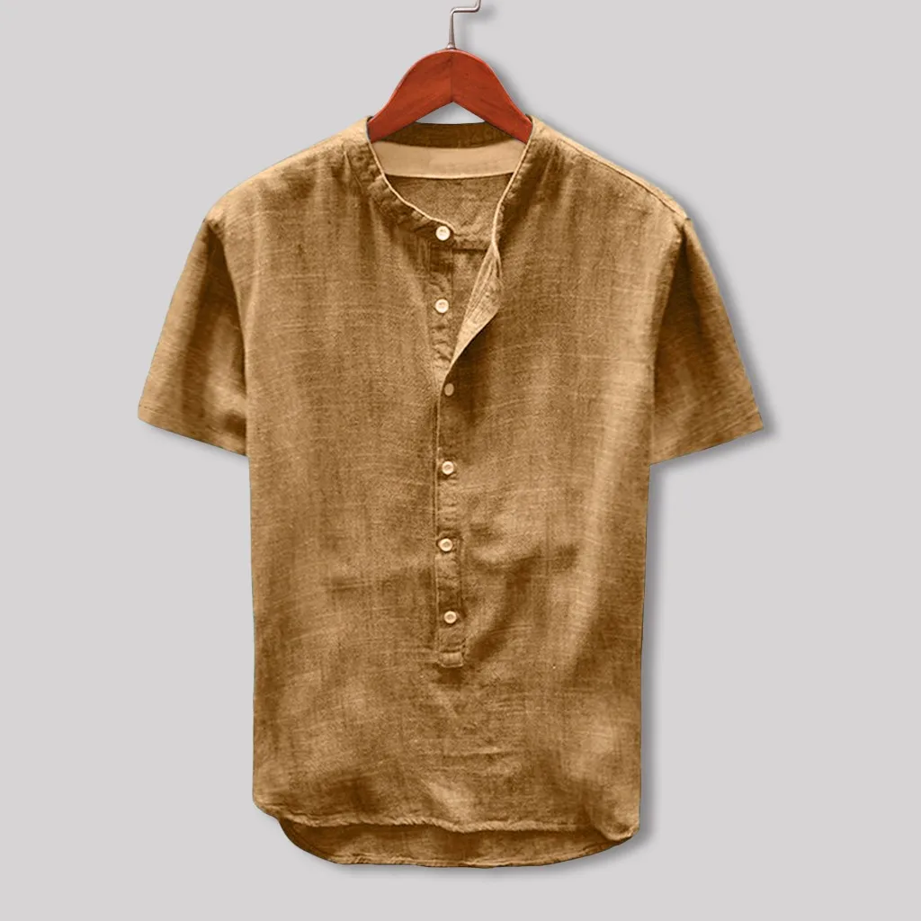 Модная Мужская Летняя Повседневная льняная и хлопковая блуза с короткими рукавами на пуговицах