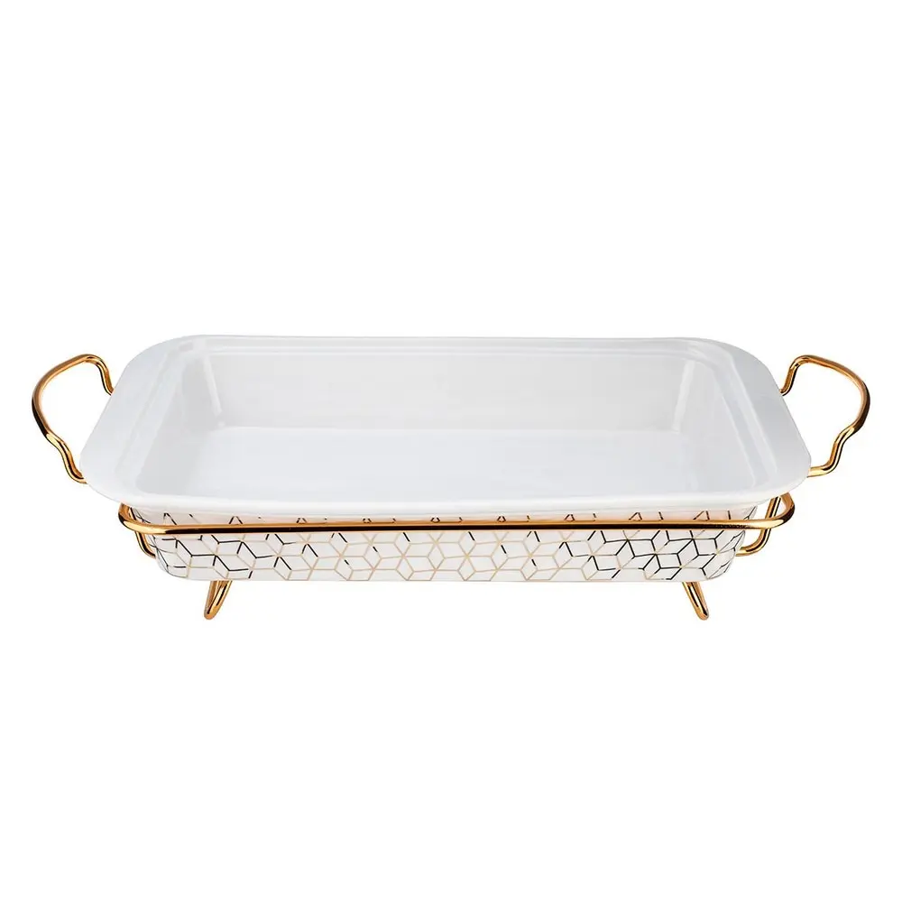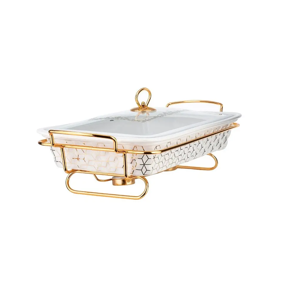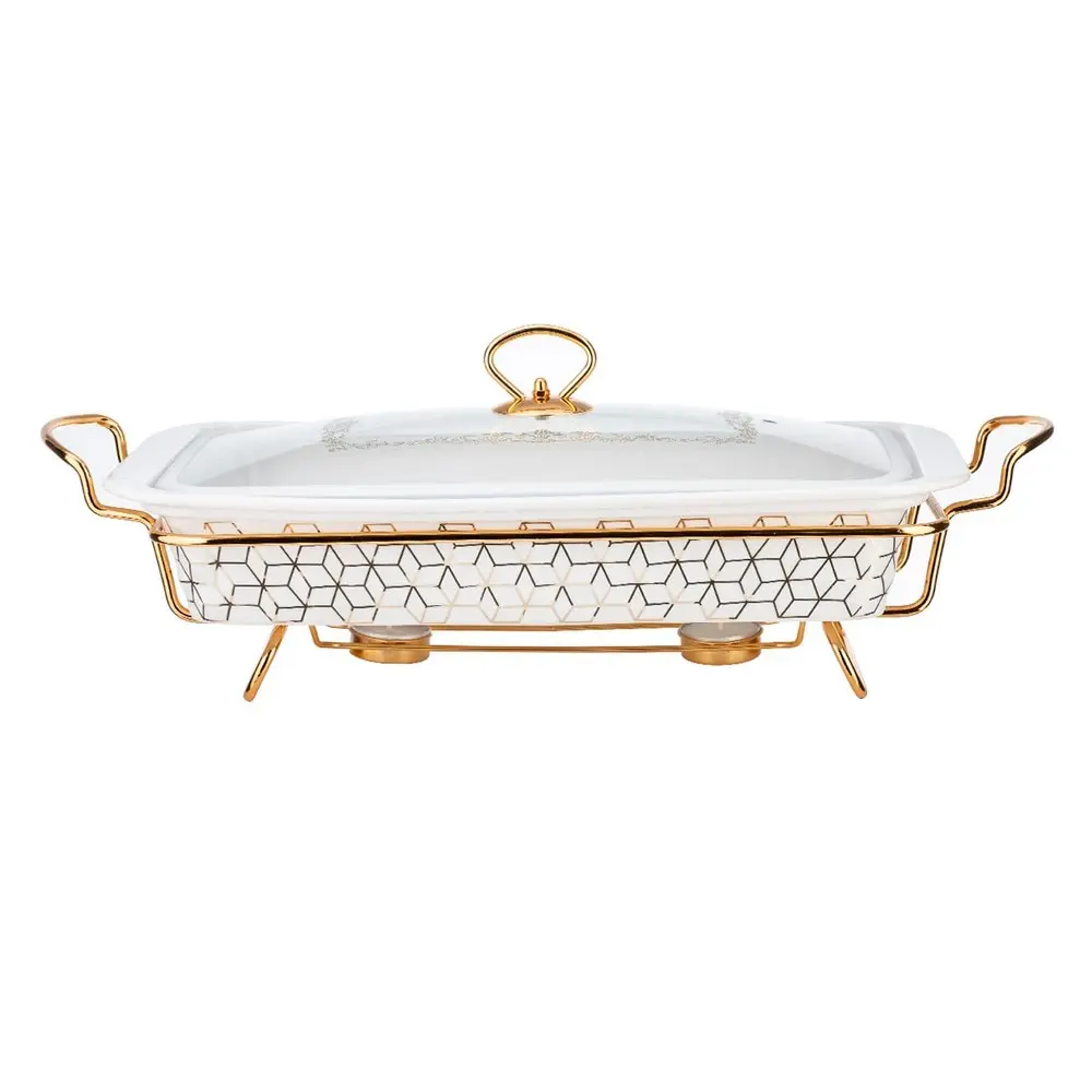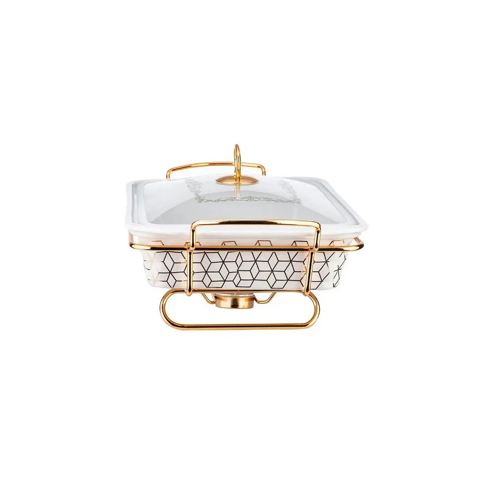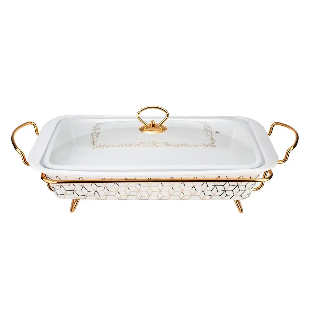 Прямоугольный мармит LARA из жаропрочного фарфора и устойчивой подставкой с золотистой отделкой - прекрасное решение для праздничной сервировки. Непрерывный подогрев от 2-х свечей сохранить блюдо горячим в течение 1-2 часов без потери вкуса. Идеально для вторых блюд и горячих закусок. Чаша изготовлена из экологичного сверхбелого фарфора с фактурными внешними стенками и золотой деколью. Все металлические элементы выполнены из стали с золотым покрытием. Для крышки использовали толстое высокопрочное стекло с паровыпуском, изящным декорированием деколью и силиконовым уплотнительным кольцом. Приподнятые ручки для безопасной переноски мармита.