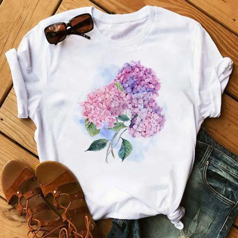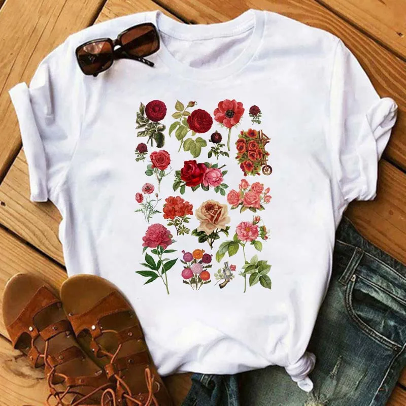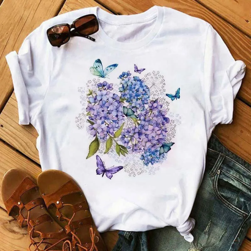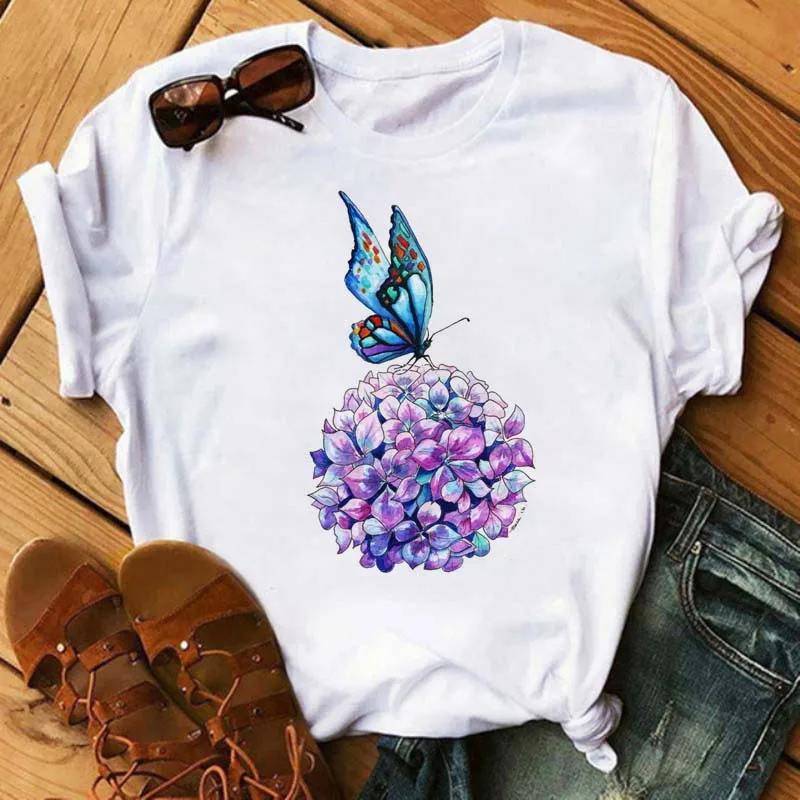 Футболки женские летние с принтом бабочек и цветов, с круглым вырезом