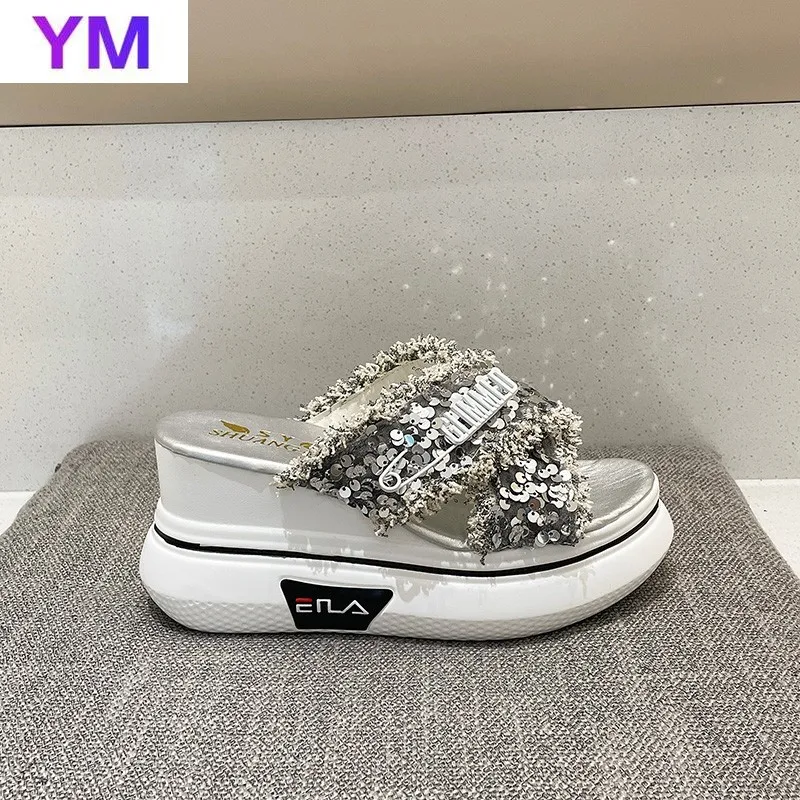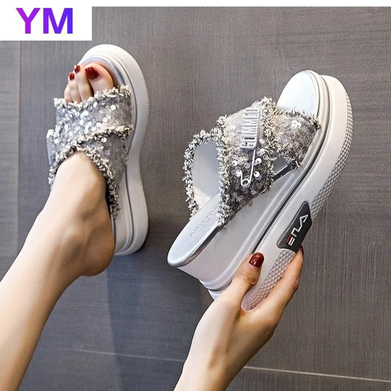 Мода 2021 Женская летняя обувь с поперечными ремешками, пляжные сандалии на танкетке; Новые сандалии на нескользящей плоской подошве; Домашние шлёпанцы; Блестящие Босоножки; Zapatos De Mujer34-39