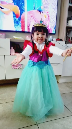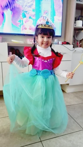На рост 124 см взяли размер 5Т (130). Нам оно великовато, а значит таблица верная. Плюс ко всему Василиска у меня очень худенькая и платье ей широковато. Материал: плотный, не просвечивает, не тянется. Состав: синтетика и хлопок. В комплекте идёт: перчатки, диадема, палочка. Застежка: потайная молния на спине. Юбка не скажу что пышная, но можно одеть подъюбник. Платье украшено пайетками и стразами, которые не отвалились после стирки. Пошито всё аккуратно - не нашла к чему придраться. Доставка: месяц. Трек: отслеживается.