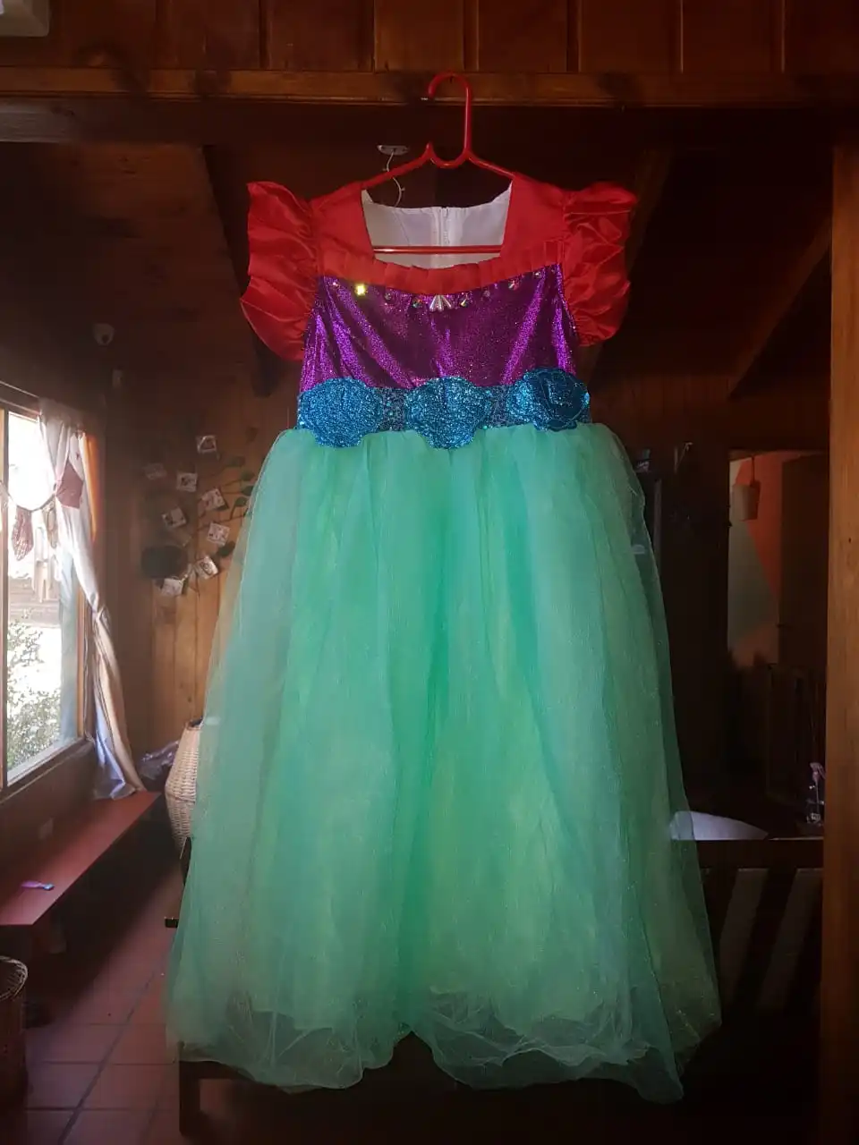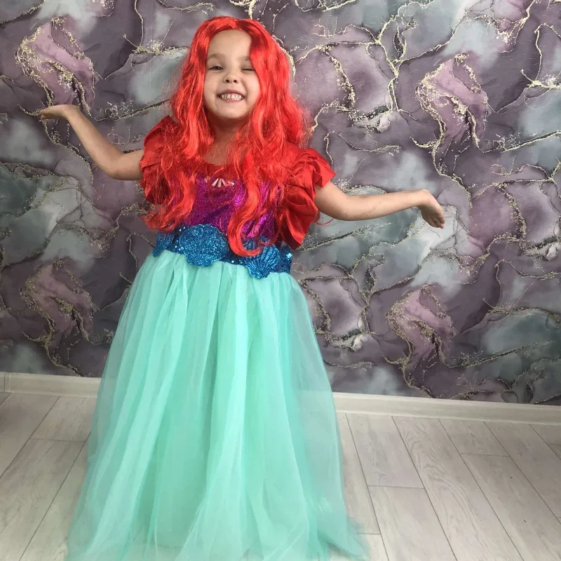 На рост 122 см, заказала размер 6т (140 см). Dress set D . Село хорошо, смотрится здорово. Русалки довольны нарядами В комплекте красный парик)) Платье пошито аккуратно, юбка состоит из нескольких слов фатина. Верх расшит пайетками и декорирован ракушками.