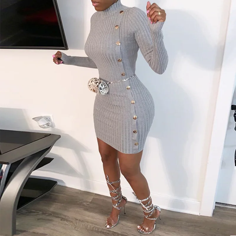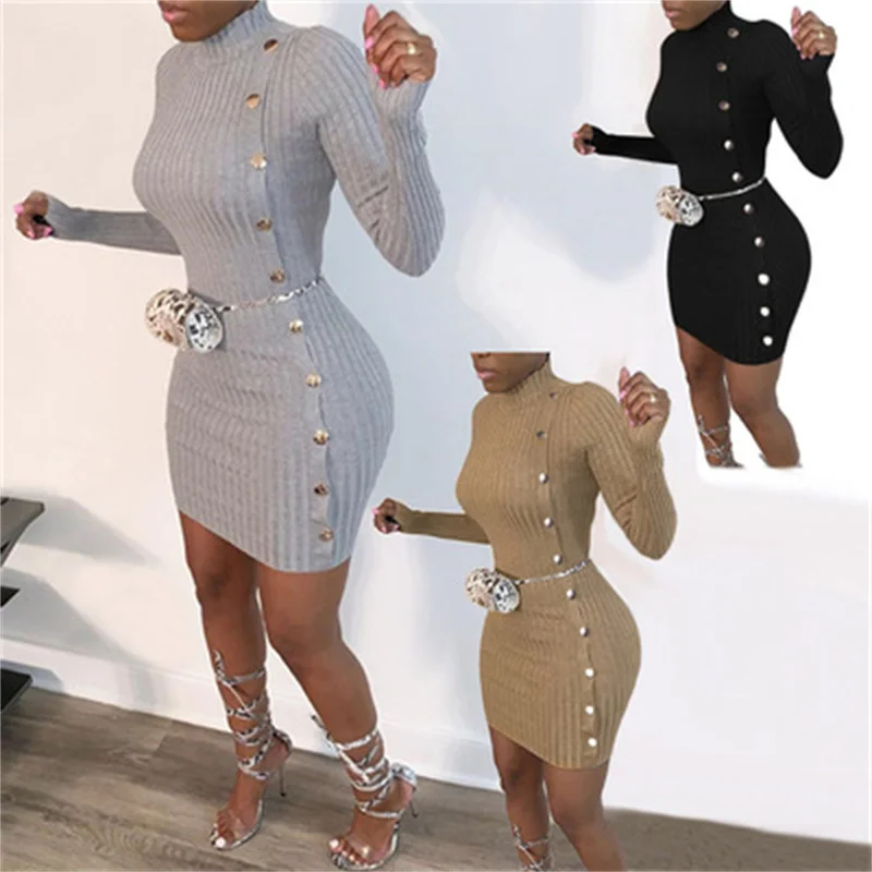 Осень 2021, женское однотонное пикантное облегающее однобортное трикотажное платье в европейском и американском стиле с длинными рукавами для женщин