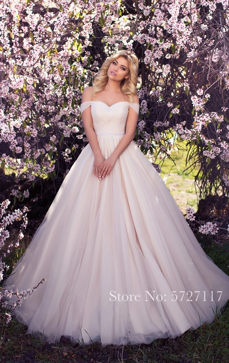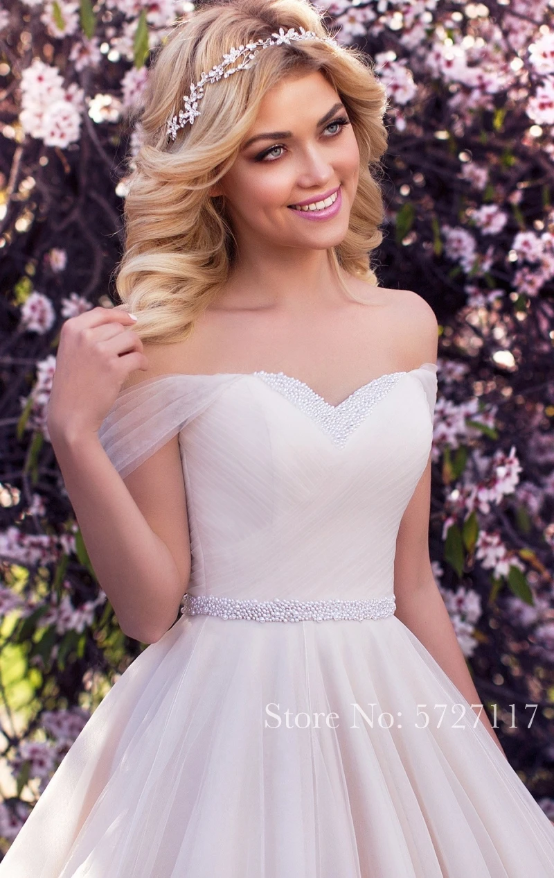Простое Тюлевое пляжное свадебное платье с открытыми плечами, трапециевидные Свадебные платья с поясом из бисера, Длинные платья невесты со шнуровкой сзади