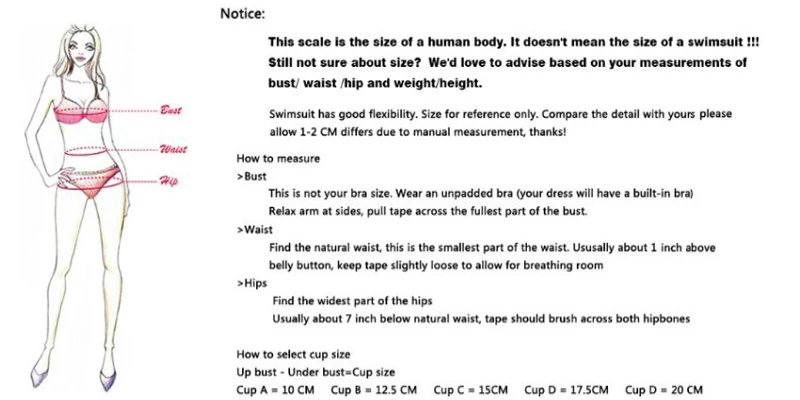 Эта шкала-это размер abody. Это не означает размер купальника 1! Все еще не уверены в размере? Wed love советует выбирать размер груди/талии/бедер и веса/гимкостюм обладает хорошей гибкостью. Размер только для справки. Сравните детали с вашим pleow 1-2 CMw tois не ваш размер бюстгальтера. Наденьте бюстгальтер без косточек (ваше платье будет иметь Встроенный бюстгальтер по бокам, потяните ленту по самой полной части бюста. Найдите естественную талию, это самая маленькая часть талии, примерно 1 дюймовая Кнопка abovbelly, Держите ленту слегка свободной, чтобы позволить себе дышать самой широкой частью В hipHow для того чтобы выбрать чашка sizeUp обхват груди-обхват под грудью = чашка sizeCup 10 см сама чашка B-12,5 см сама чашка C - L5CMD 17 5 см сама чашка D = 20 См