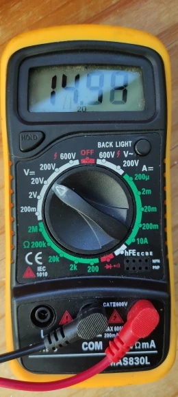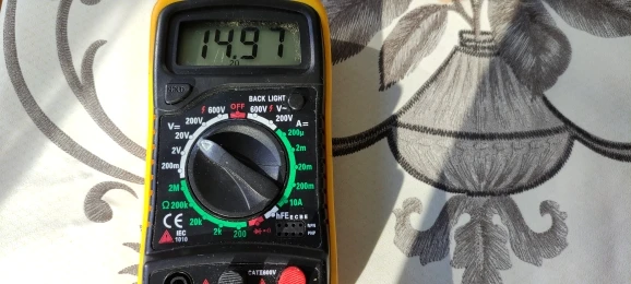 a pleno sol de invierno sobre las 12 del mediodía me está dando 14,97 v y he probado a conectar un coche de slot por hacer una prueba, y baja 13,80 v un amperaje de 0,2 , por dentro del cristal de la ventana baja unos 0,30 voltios. También he puesto a cargar un móvil en la toma USB y funciona perfectamente