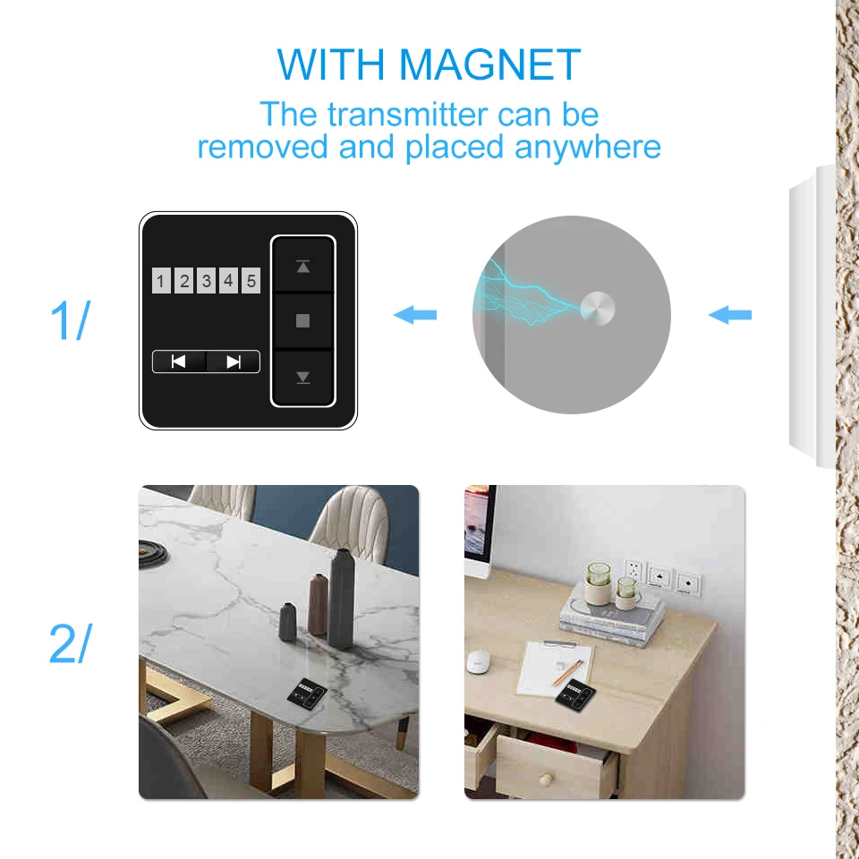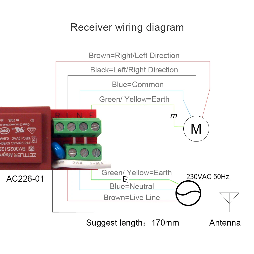 Вам нужно только подключить AC226 к мотору, и тогда Мотор будет управляться с помощью пульта дистанционного управления. Пульт дистанционного управления AC133-5CH можно переносить или устанавливать на стене. Приемник AC226: напряжение 220 В, просто подключите двигатель, как показано на рисунке. Передатчик AC133-5CH: необходимо установить батарею 3 в CR2032, подключить до 5 приемников AC226. Сфера применения: электрические шторы, дверцы с электрическими жалюзи, электрические жалюзи, электрические зонтики и т. д.