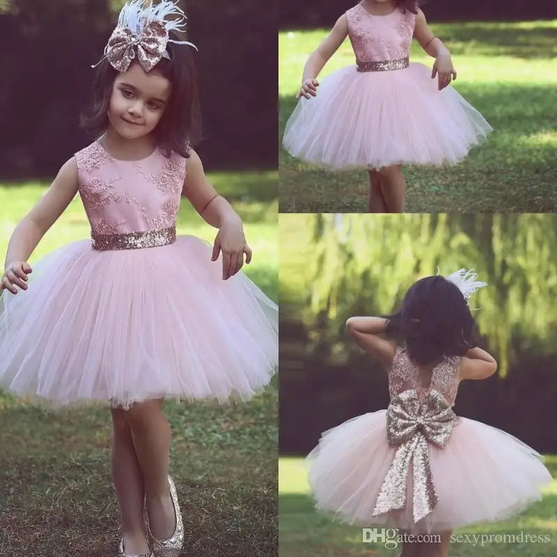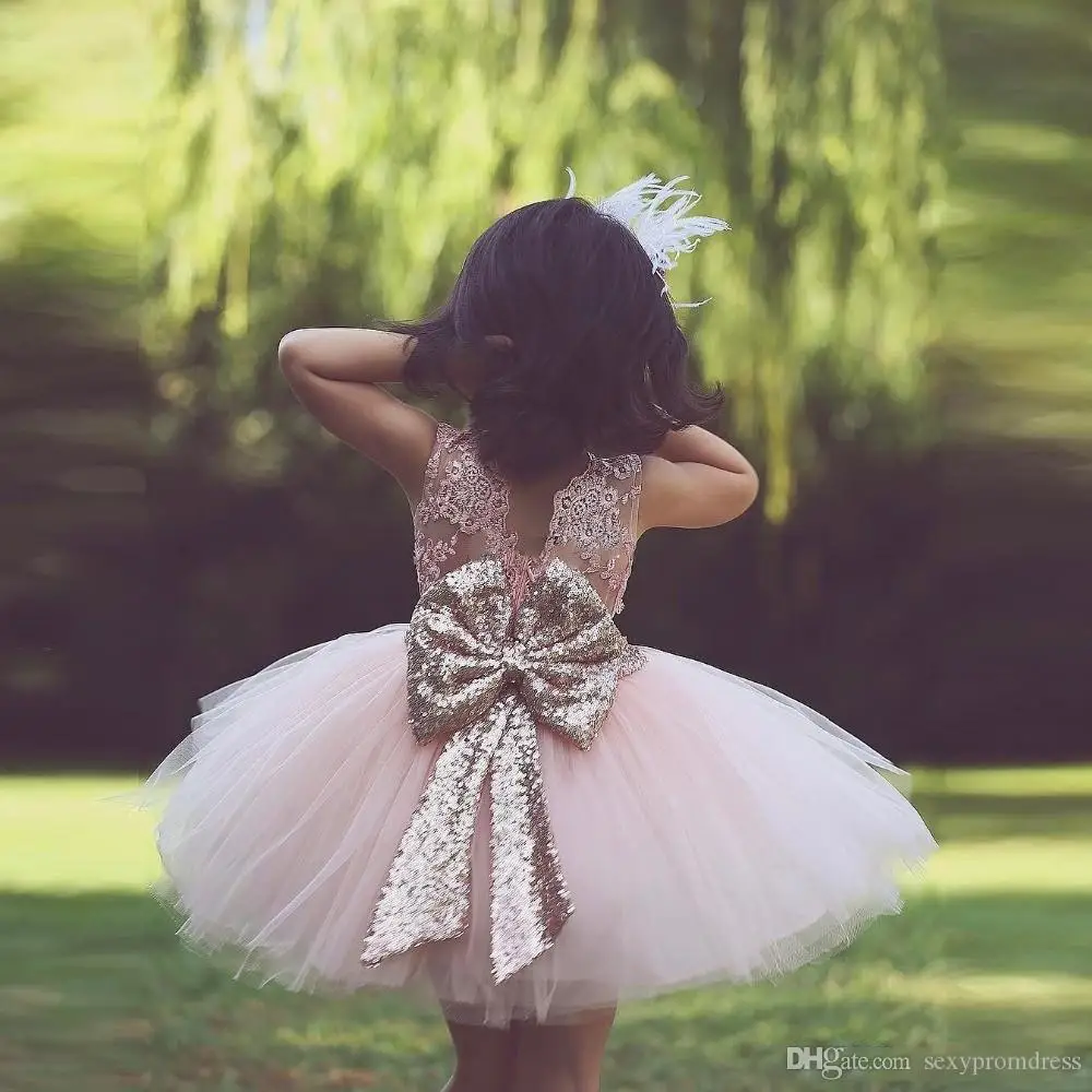 Розовый по колено для девочек, Пышное Платье с низким вырезом на спине и золотой Sequied, с бантом, с кружевной аппликацией, без рукавов для девочек в цветочек, платья для свадьбы, платья из фатина для девочек