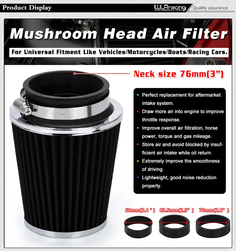 Универсальный автомобильный воздушный фильтр с высоким потоком холодного воздуха для впуска воздуха на входе, воздушный фильтр с грибной головкой для шеи 76 мм70 мм63,5 мм60 мм