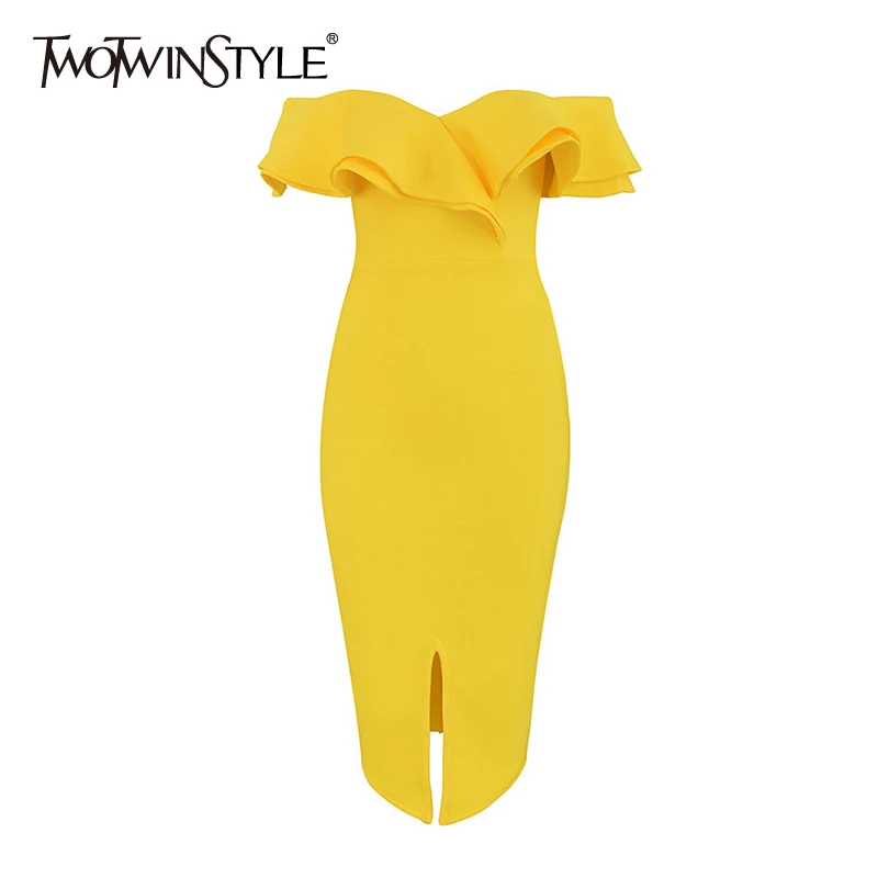 Женские вечерние платья TWOTWINSTYEL, желтое платье с открытыми плечами и оборками на рукавах, высокая талия, 2021